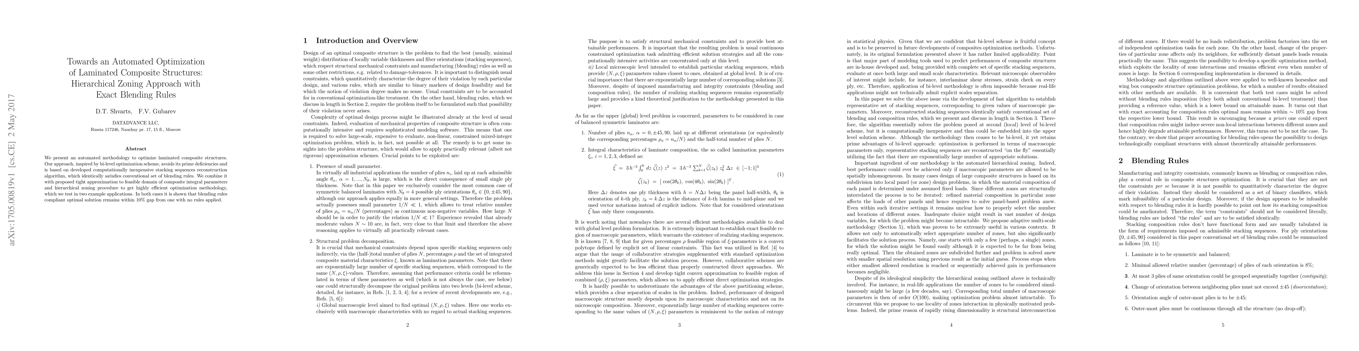 This paper introduces an automated optimization methodology for laminated composite structures using a hierarchical zoning approach and exact blending rules, achieving near-optimal solutions within a 10% gap compared to unrestricted optimization. The method employs a computationally efficient stacking sequence reconstruction algorithm and a tight approximation of feasible parameter domains.