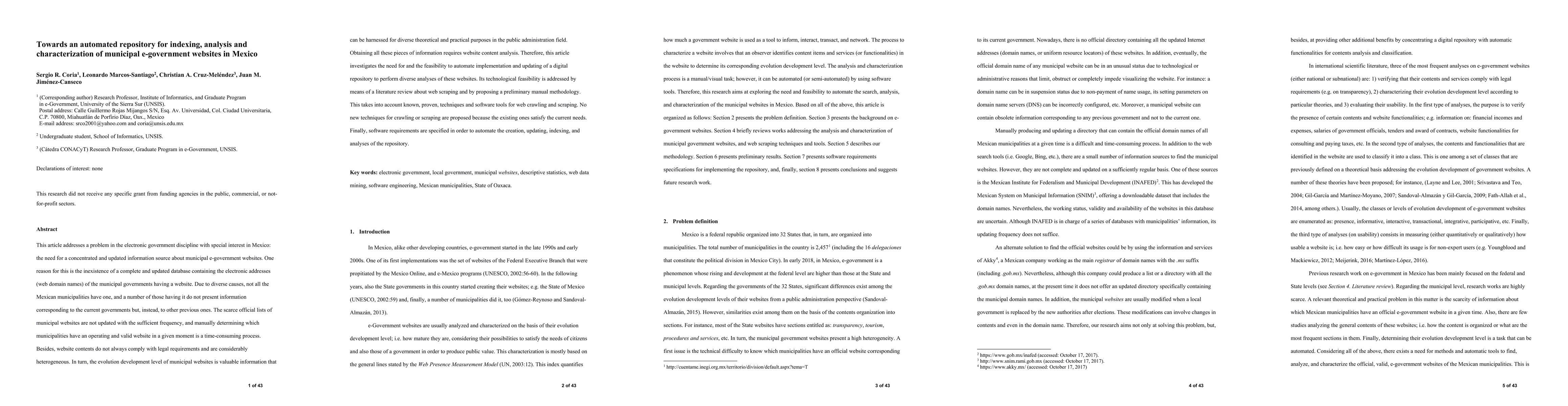 This article addresses a problem in the electronic government discipline with special interest in Mexico: the need for a concentrated and updated information source about municipal e-government websites. One reason for this is the lack of a complete and updated database containing the electronic addresses (web domain names) of the municipal governments having a website. Due to diverse causes, not all the Mexican municipalities have one, and a number of those having it do not present information corresponding to the current governments but, instead, to other previous ones. The scarce official lists of municipal websites are not updated with the sufficient frequency, and manually determining which municipalities have an operating and valid website in a given moment is a time-consuming process. Besides, website contents do not always comply with legal requirements and are considerably heterogeneous. In turn, the evolution development level of municipal websites is valuable information that can be harnessed for diverse theoretical and practical purposes in the public administration field. Obtaining all these pieces of information requires website content analysis. Therefore, this article investigates the need for and the feasibility to automate implementation and updating of a digital repository to perform diverse analyses of these websites. Its technological feasibility is addressed by means of a literature review about web scraping and by proposing a preliminary manual methodology. This takes into account known, proven, techniques and software tools for web crawling and scraping. No new techniques for crawling or scraping are proposed because the existing ones satisfy the current needs. Finally, software requirements are specified in order to automate the creation, updating, indexing, and analyses of the repository.
