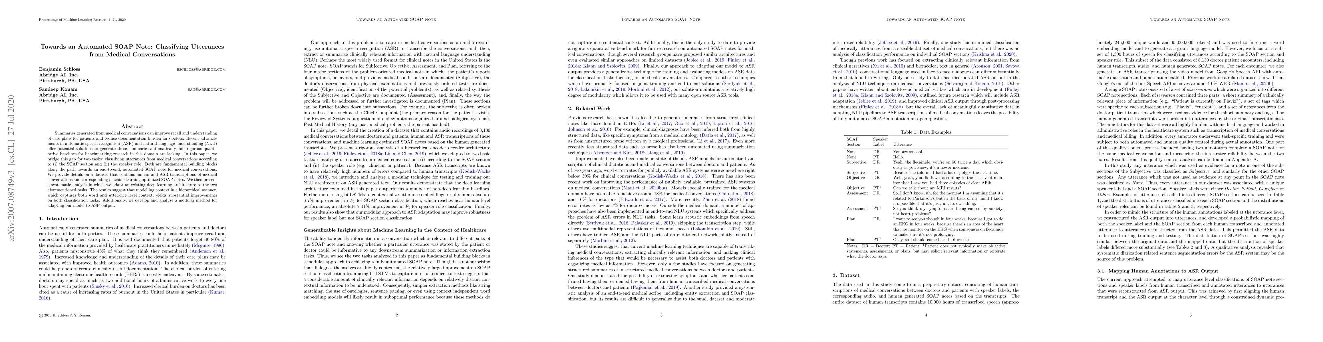 Summaries generated from medical conversations can improve recall and understanding of care plans for patients and reduce documentation burden for doctors. Recent advancements in automatic speech recognition (ASR) and natural language understanding (NLU) offer potential solutions to generate these summaries automatically, but rigorous quantitative baselines for benchmarking research in this domain are lacking. In this paper, we bridge this gap for two tasks: classifying utterances from medical conversations according to (i) the SOAP section and (ii) the speaker role. Both are fundamental building blocks along the path towards an end-to-end, automated SOAP note for medical conversations. We provide details on a dataset that contains human and ASR transcriptions of medical conversations and corresponding machine learning optimized SOAP notes. We then present a systematic analysis in which we adapt an existing deep learning architecture to the two aforementioned tasks. The results suggest that modelling context in a hierarchical manner, which captures both word and utterance level context, yields substantial improvements on both classification tasks. Additionally, we develop and analyze a modular method for adapting our model to ASR output.