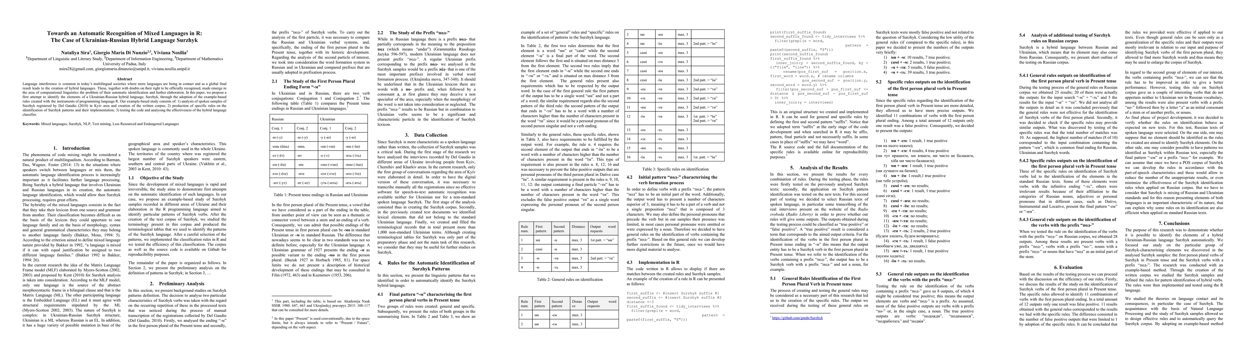 Language interference is common in today's multilingual societies where more languages are being in contact and as a global final result leads to the creation of hybrid languages. These, together with doubts on their right to be officially recognised made emerge in the area of computational linguistics the problem of their automatic identification and further elaboration. In this paper, we propose a first attempt to identify the elements of a Ukrainian-Russian hybrid language, Surzhyk, through the adoption of the example-based rules created with the instruments of programming language R. Our example-based study consists of: 1) analysis of spoken samples of Surzhyk registered by Del Gaudio (2010) in Kyiv area and creation of the written corpus; 2) production of specific rules on the identification of Surzhyk patterns and their implementation; 3) testing the code and analysing the effectiveness.
