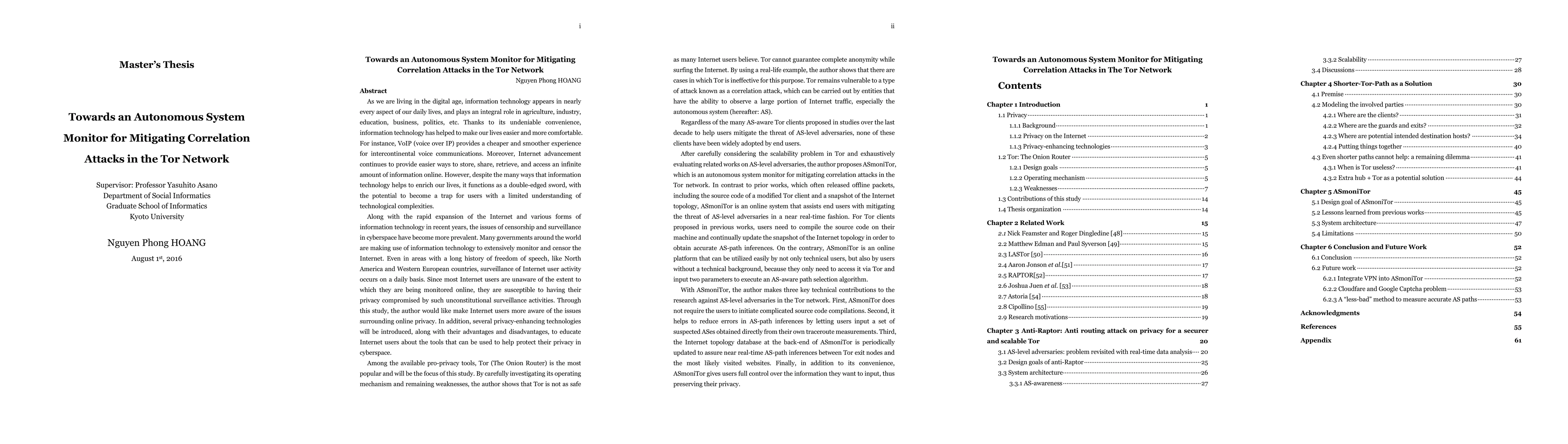 After carefully considering the scalability problem in Tor and exhaustively evaluating related works on AS-level adversaries, the author proposes ASmoniTor, which is an autonomous system monitor for mitigating correlation attacks in the Tor network. In contrast to prior works, which often released offline packets, including the source code of a modified Tor client and a snapshot of the Internet topology, ASmoniTor is an online system that assists end users with mitigating the threat of AS-level adversaries in a near real-time fashion. For Tor clients proposed in previous works, users need to compile the source code on their machine and continually update the snapshot of the Internet topology in order to obtain accurate AS-path inferences. On the contrary, ASmoniTor is an online platform that can be utilized easily by not only technical users, but also by users without a technical background, because they only need to access it via Tor and input two parameters to execute an AS-aware path selection algorithm. With ASmoniTor, the author makes three key technical contributions to the research against AS-level adversaries in the Tor network. First, ASmoniTor does not require the users to initiate complicated source code compilations. Second, it helps to reduce errors in AS-path inferences by letting users input a set of suspected ASes obtained directly from their own traceroute measurements. Third, the Internet topology database at the back-end of ASmoniTor is periodically updated to assure near real-time AS-path inferences between Tor exit nodes and the most likely visited websites. Finally, in addition to its convenience, ASmoniTor gives users full control over the information they want to input, thus preserving their privacy.
