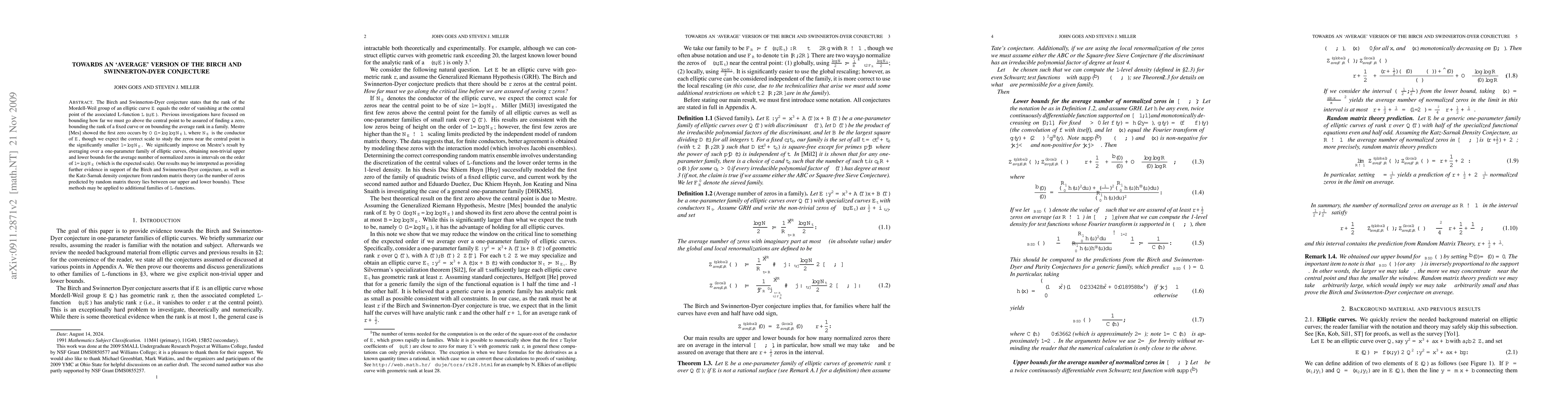The Birch and Swinnerton-Dyer conjecture states that the rank of the Mordell-Weil group of an elliptic curve E equals the order of vanishing at the central point of the associated L-function L(s,E). Previous investigations have focused on bounding how far we must go above the central point to be assured of finding a zero, bounding the rank of a fixed curve or on bounding the average rank in a family. Mestre showed the first zero occurs by O(1/loglog(N_E)), where N_E is the conductor of E, though we expect the correct scale to study the zeros near the central point is the significantly smaller 1/log(N_E). We significantly improve on Mestre's result by averaging over a one-parameter family of elliptic curves, obtaining non-trivial upper and lower bounds for the average number of normalized zeros in intervals on the order of 1/log(N_E) (which is the expected scale). Our results may be interpreted as providing further evidence in support of the Birch and Swinnerton-Dyer conjecture, as well as the Katz-Sarnak density conjecture from random matrix theory (as the number of zeros predicted by random matrix theory lies between our upper and lower bounds). These methods may be applied to additional families of L-functions.