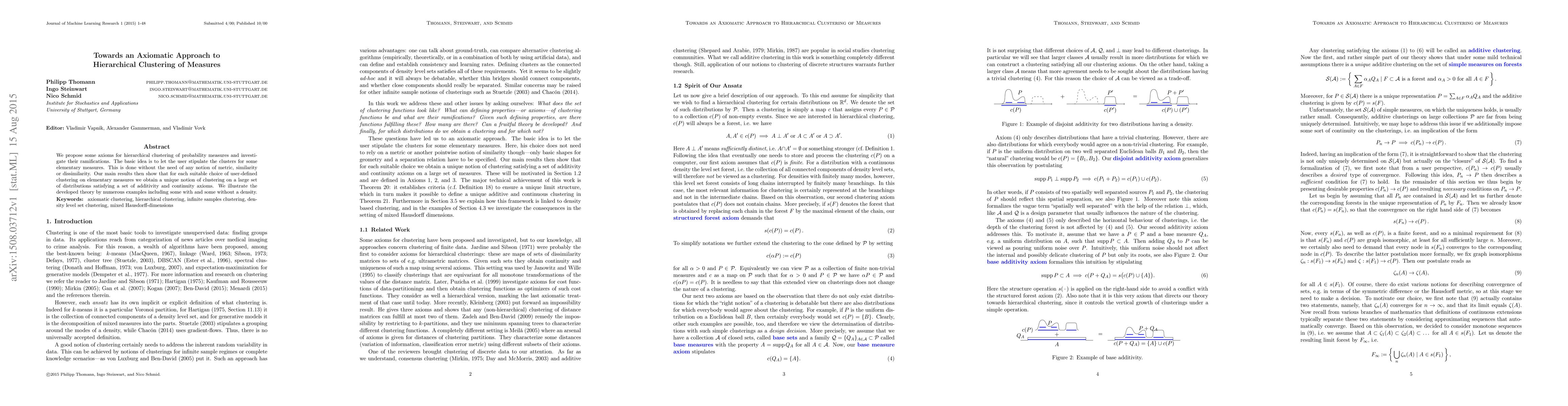 We propose some axioms for hierarchical clustering of probability measures and investigate their ramifications. The basic idea is to let the user stipulate the clusters for some elementary measures. This is done without the need of any notion of metric, similarity or dissimilarity. Our main results then show that for each suitable choice of user-defined clustering on elementary measures we obtain a unique notion of clustering on a large set of distributions satisfying a set of additivity and continuity axioms. We illustrate the developed theory by numerous examples including some with and some without a density.