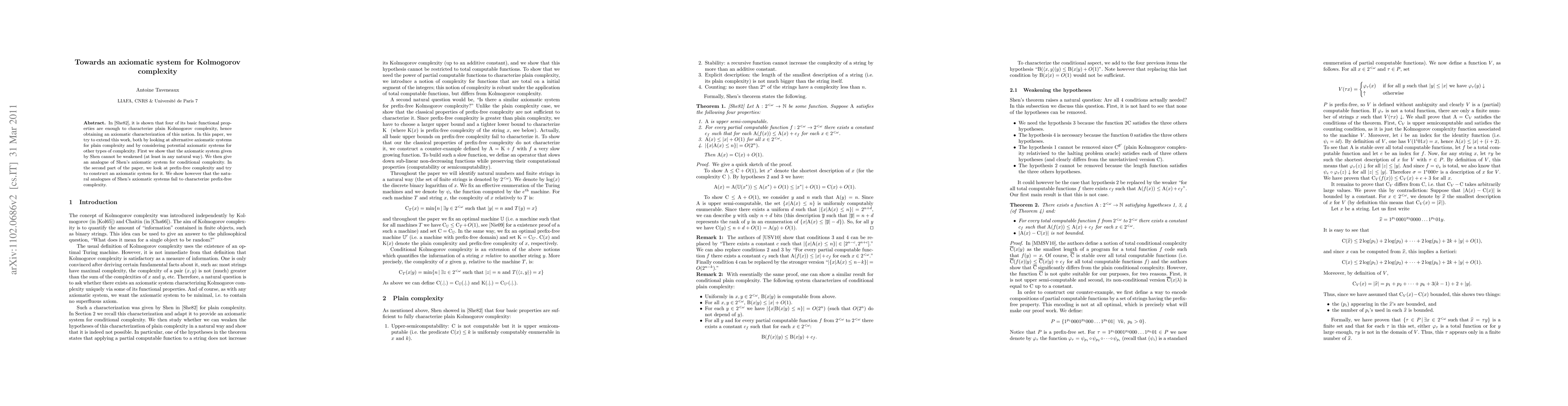 In [She82], it is shown that four basic functional properties are enough to characterize plain Kolmogorov complexity, hence obtaining an axiomatic characterization of this notion. In this paper, we try to extend this work, both by looking at alternative axiomatic systems for plain complexity and by considering potential axiomatic systems for other types of complexity. First we show that the axiomatic system given by Shen cannot be weakened (at least in any natural way). We then give an analogue of Shen's axiomatic system for conditional complexity. In a the second part of the paper, we look at prefix-free complexity and try to construct an axiomatic system for it. We show however that the natural analogues of Shen's axiomatic systems fails to characterize prefix-free complexity.