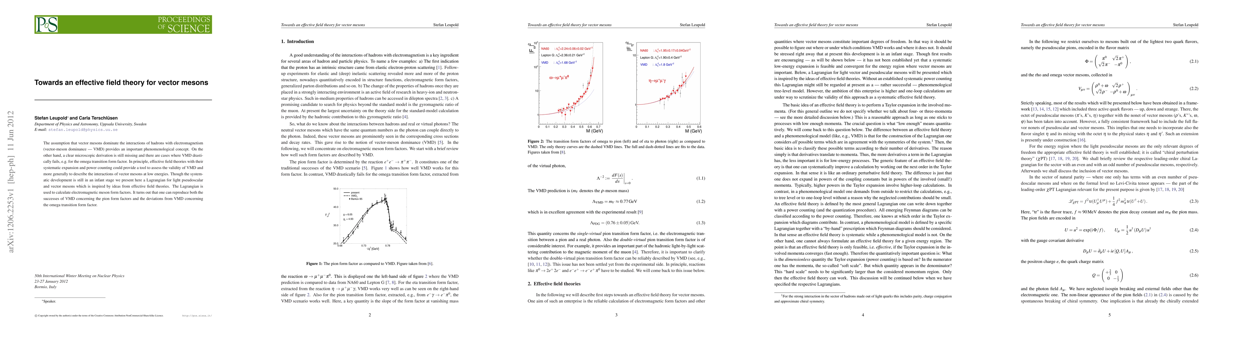 The assumption that vector mesons dominate the interactions of hadrons with electromagnetism (vector-meson dominance - VMD) provides an important phenomenological concept. On the other hand, a clear microscopic derivation is still missing and there are cases where VMD drastically fails, e.g. for the omega transition form factor. In principle, effective field theories with their systematic expansion and power counting could provide a tool to assess the validity of VMD and more generally to describe the interactions of vector mesons at low energies. Though the systematic development is still in an infant stage we present here a Lagrangian for light pseudoscalar and vector mesons which is inspired by ideas from effective field theories. The Lagrangian is used to calculate electromagnetic meson form factors. It turns out that one can reproduce both the successes of VMD concerning the pion form factors and the deviations from VMD concerning the omega transition form factor.