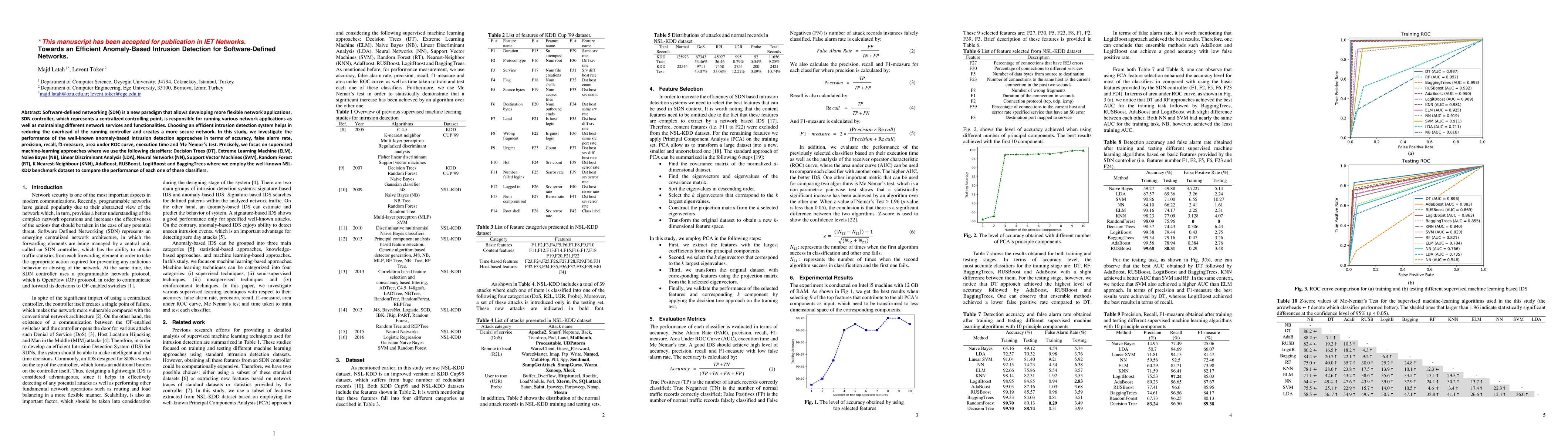 This paper evaluates the performance of various supervised machine-learning classifiers—including Decision Trees, Extreme Learning Machine, and others—for anomaly-based intrusion detection in Software-Defined Networks (SDN). The study uses the NSL-KDD dataset to compare metrics like accuracy, false alarm rate, and execution time to identify the most efficient intrusion detection method for SDN controllers.