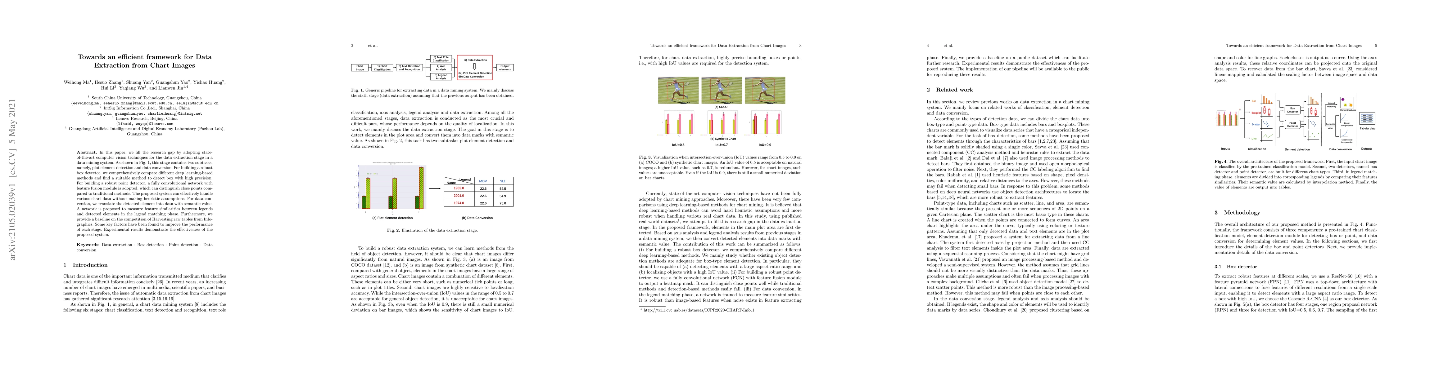 In this paper, we fill the research gap by adopting state-of-the-art computer vision techniques for the data extraction stage in a data mining system. As shown in Fig.1, this stage contains two subtasks, namely, plot element detection and data conversion. For building a robust box detector, we comprehensively compare different deep learning-based methods and find a suitable method to detect box with high precision. For building a robust point detector, a fully convolutional network with feature fusion module is adopted, which can distinguish close points compared to traditional methods. The proposed system can effectively handle various chart data without making heuristic assumptions. For data conversion, we translate the detected element into data with semantic value. A network is proposed to measure feature similarities between legends and detected elements in the legend matching phase. Furthermore, we provide a baseline on the competition of Harvesting raw tables from Infographics. Some key factors have been found to improve the performance of each stage. Experimental results demonstrate the effectiveness of the proposed system.