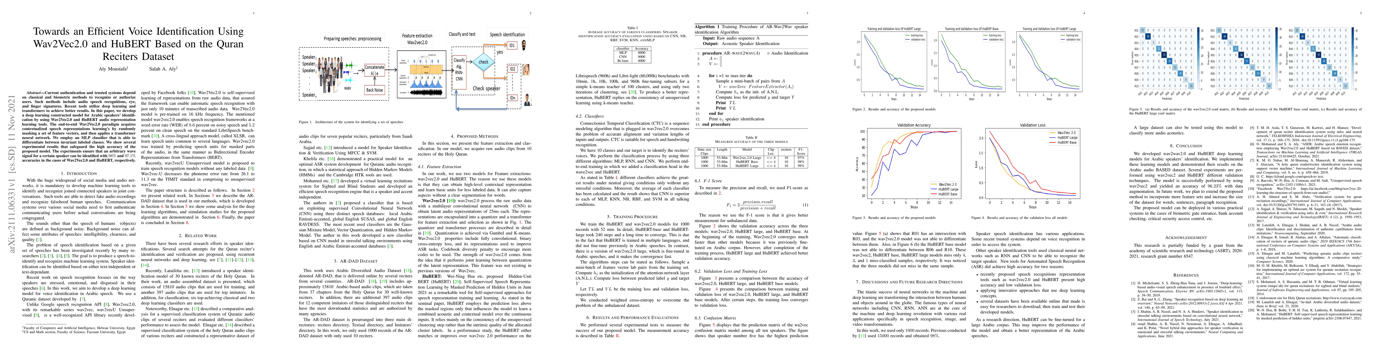 Current authentication and trusted systems depend on classical and biometric methods to recognize or authorize users. Such methods include audio speech recognitions, eye, and finger signatures. Recent tools utilize deep learning and transformers to achieve better results. In this paper, we develop a deep learning constructed model for Arabic speakers identification by using Wav2Vec2.0 and HuBERT audio representation learning tools. The end-to-end Wav2Vec2.0 paradigm acquires contextualized speech representations learnings by randomly masking a set of feature vectors, and then applies a transformer neural network. We employ an MLP classifier that is able to differentiate between invariant labeled classes. We show several experimental results that safeguard the high accuracy of the proposed model. The experiments ensure that an arbitrary wave signal for a certain speaker can be identified with 98% and 97.1% accuracies in the cases of Wav2Vec2.0 and HuBERT, respectively.