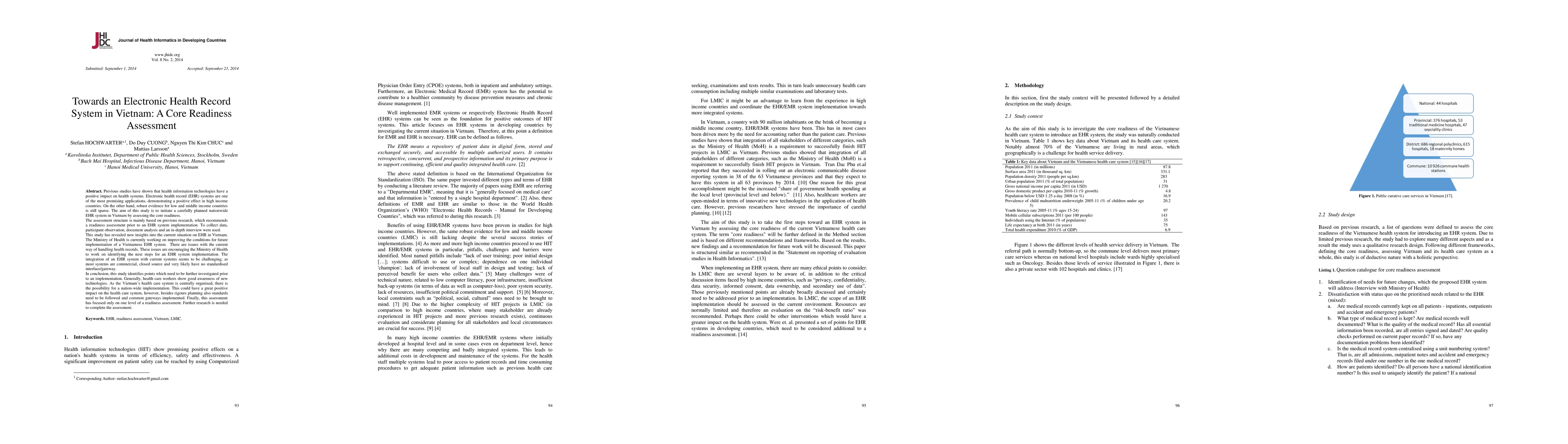 This study assesses the core readiness for implementing an Electronic Health Record (EHR) system in Vietnam, highlighting the need for further investigation and planning. While health care workers show good awareness, integrating EHR with existing commercial, closed systems poses challenges, and further research is required to complete the readiness assessment.