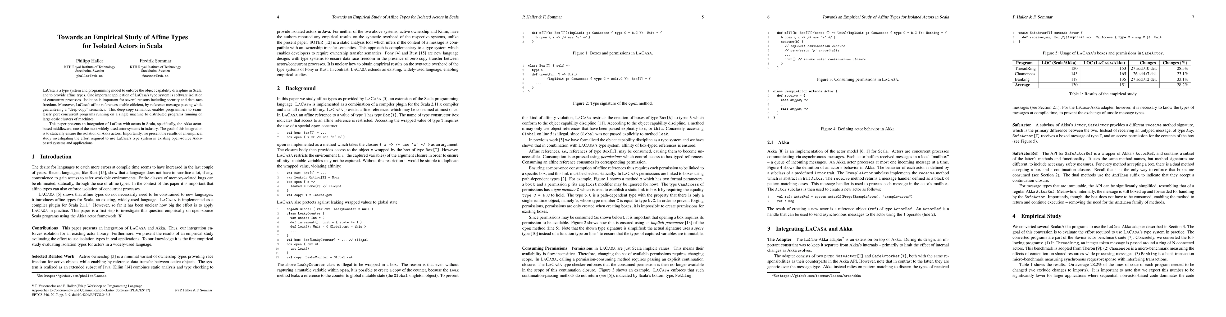 LaCasa is a type system and programming model to enforce the object capability discipline in Scala, and to provide affine types. One important application of LaCasa's type system is software isolation of concurrent processes. Isolation is important for several reasons including security and data-race freedom. Moreover, LaCasa's affine references enable efficient, by-reference message passing while guaranteeing a "deep-copy" semantics. This deep-copy semantics enables programmers to seamlessly port concurrent programs running on a single machine to distributed programs running on large-scale clusters of machines. This paper presents an integration of LaCasa with actors in Scala, specifically, the Akka actor-based middleware, one of the most widely-used actor systems in industry. The goal of this integration is to statically ensure the isolation of Akka actors. Importantly, we present the results of an empirical study investigating the effort required to use LaCasa's type system in existing open-source Akka-based systems and applications.