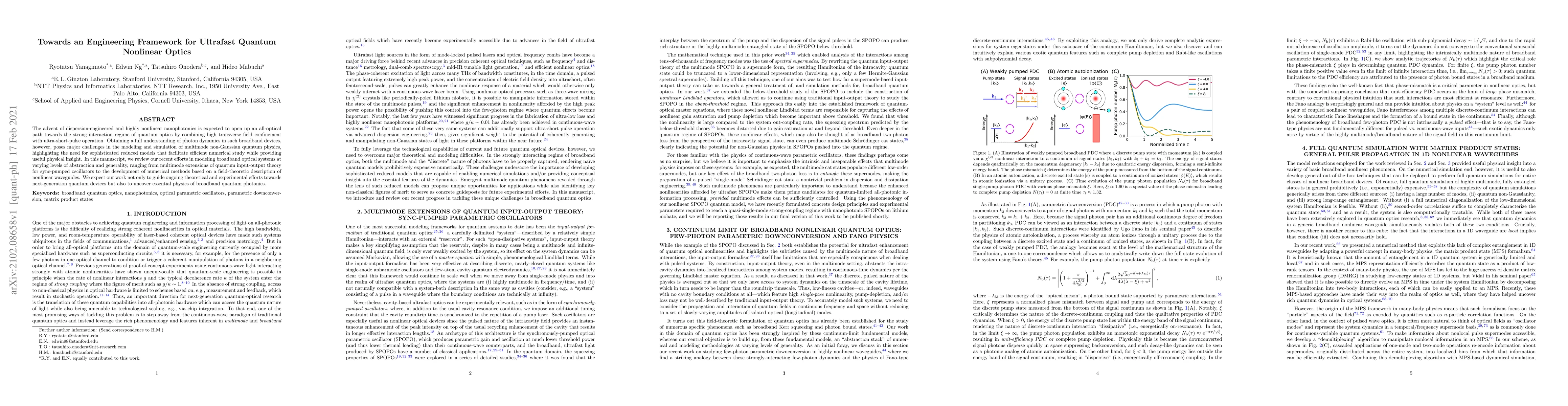 The advent of dispersion-engineered and highly nonlinear nanophotonics is expected to open up an all-optical path towards the strong-interaction regime of quantum optics by combining high transverse field confinement with ultra-short-pulse operation. Obtaining a full understanding of photon dynamics in such broadband devices, however, poses major challenges in the modeling and simulation of multimode non-Gaussian quantum physics, highlighting the need for sophisticated reduced models that facilitate efficient numerical study while providing useful physical insight. In this manuscript, we review our recent efforts in modeling broadband optical systems at varying levels of abstraction and generality, ranging from multimode extensions of quantum input-output theory for sync-pumped oscillators to the development of numerical methods based on a field-theoretic description of nonlinear waveguides. We expect our work not only to guide ongoing theoretical and experimental efforts towards next-generation quantum devices but also to uncover essential physics of broadband quantum photonics.