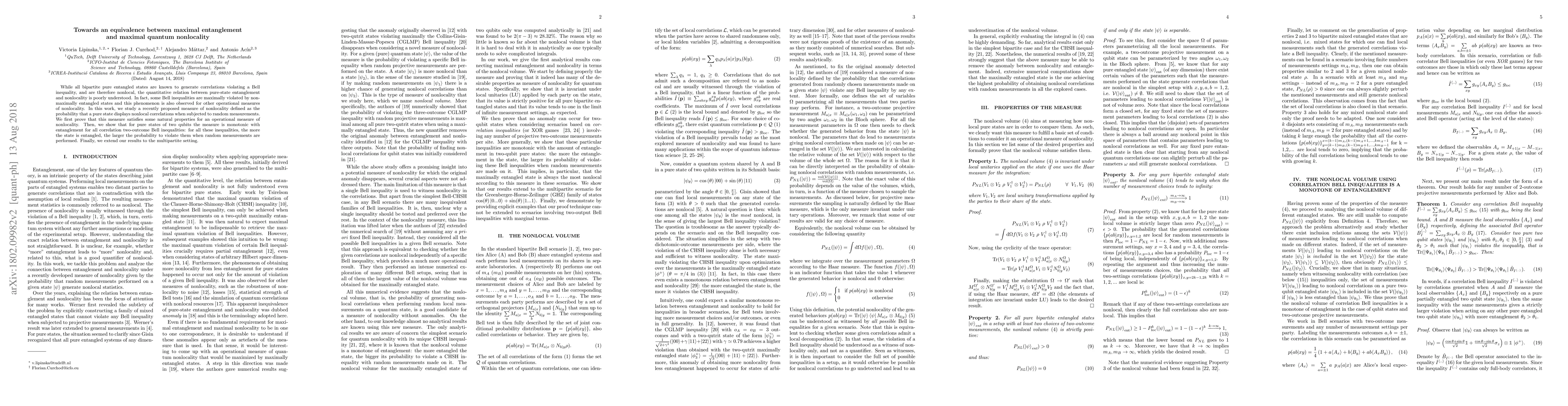 This paper explores the quantitative link between maximal entanglement and maximal quantum nonlocality, demonstrating that for two-qubit pure states, a specific measure of nonlocality is monotonically related to entanglement, meaning higher entanglement correlates with greater nonlocality. The study extends these findings to multipartite systems.