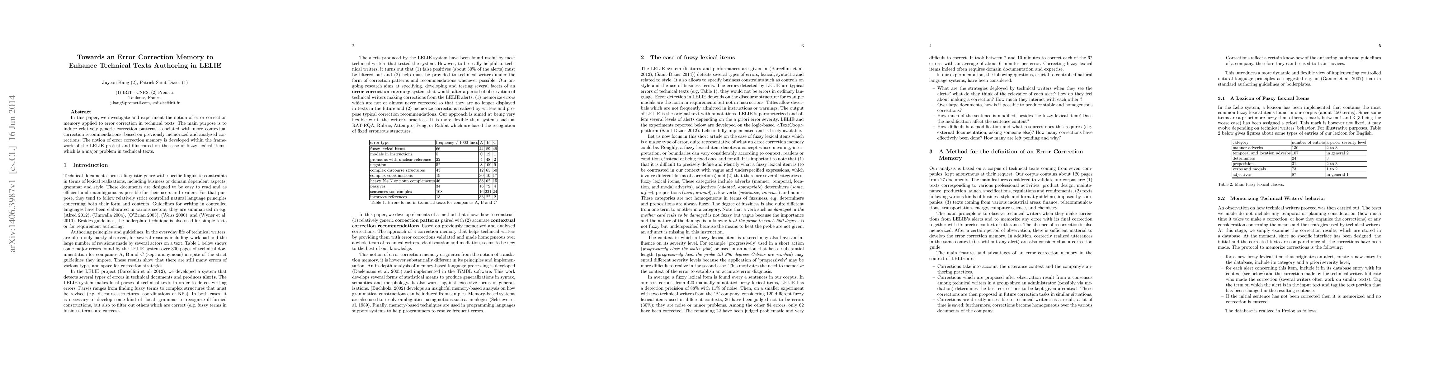 This paper explores the concept of error correction memory to improve technical texts by inducing generic correction patterns based on previously analyzed errors, specifically addressing the issue of fuzzy lexical items within the LELIE project. The aim is to provide contextual correction recommendations through a memory system that learns from past corrections.