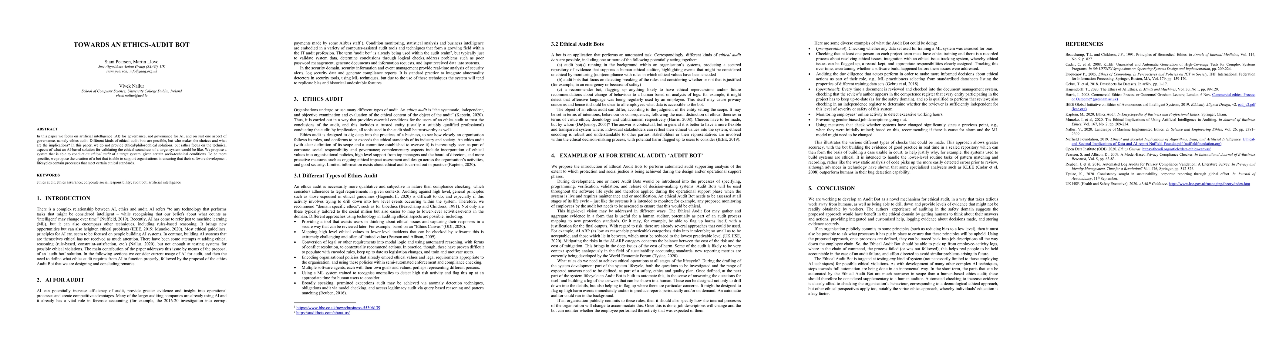 In this paper we focus on artificial intelligence (AI) for governance, not governance for AI, and on just one aspect of governance, namely ethics audit. Different kinds of ethical audit bots are possible, but who makes the choices and what are the implications? In this paper, we do not provide ethical/philosophical solutions, but rather focus on the technical aspects of what an AI-based solution for validating the ethical soundness of a target system would be like. We propose a system that is able to conduct an ethical audit of a target system, given certain socio-technical conditions. To be more specific, we propose the creation of a bot that is able to support organisations in ensuring that their software development lifecycles contain processes that meet certain ethical standards.