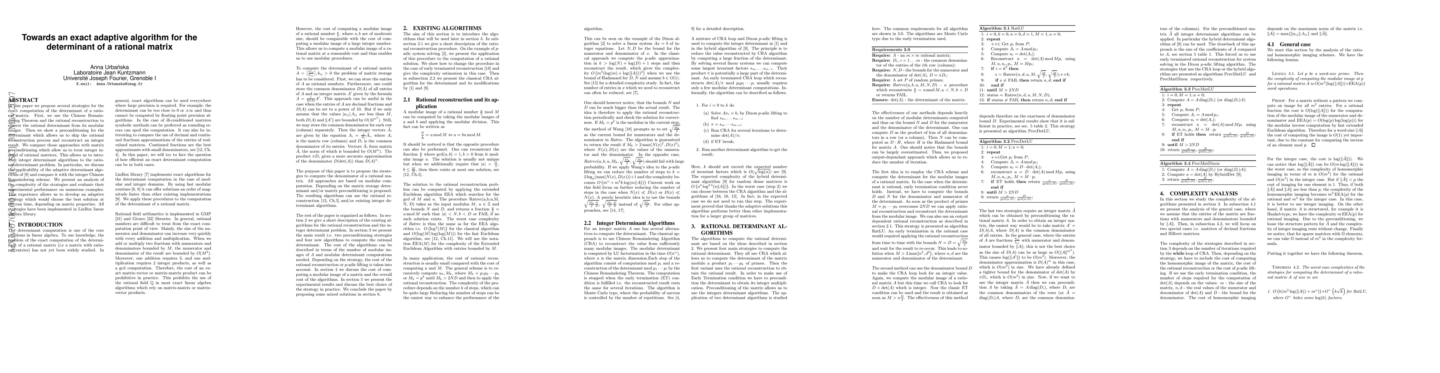 In this paper we propose several strategies for the exact computation of the determinant of a rational matrix. First, we use the Chinese Remaindering Theorem and the rational reconstruction to recover the rational determinant from its modular images. Then we show a preconditioning for the determinant which allows us to skip the rational reconstruction process and reconstruct an integer result. We compare those approaches with matrix preconditioning which allow us to treat integer instead of rational matrices. This allows us to introduce integer determinant algorithms to the rational determinant problem. In particular, we discuss the applicability of the adaptive determinant algorithm of [9] and compare it with the integer Chinese Remaindering scheme. We present an analysis of the complexity of the strategies and evaluate their experimental performance on numerous examples. This experience allows us to develop an adaptive strategy which would choose the best solution at the run time, depending on matrix properties. All strategies have been implemented in LinBox linear algebra library.