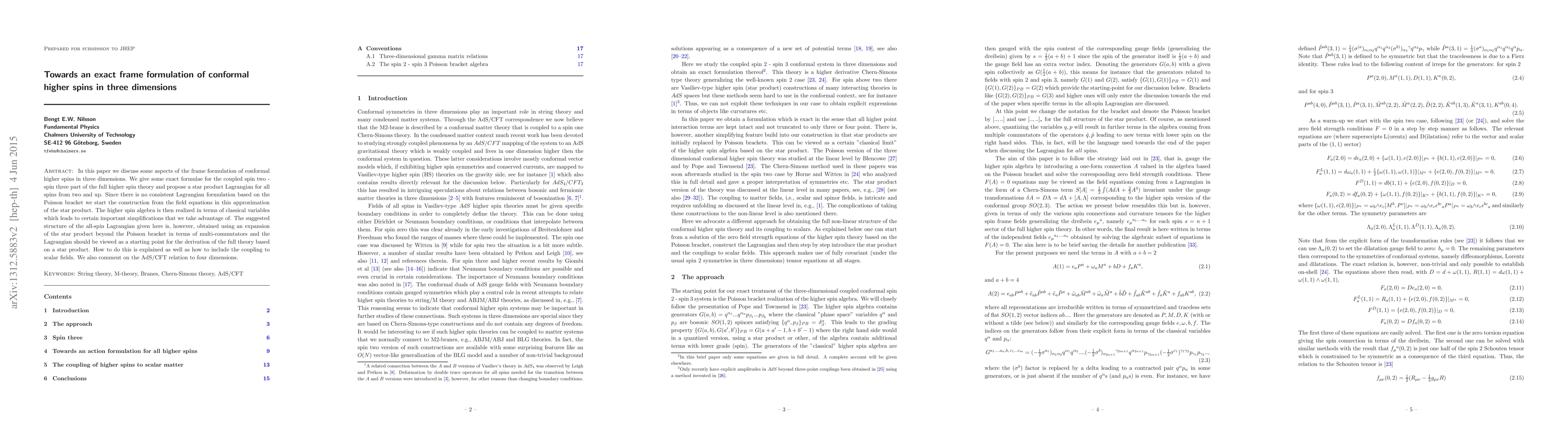 In this note we discuss some aspects of the frame formulation of conformal higher spins in three dimensions. We give some exact formulae for the coupled spin two - spin three part of the full higher spin theory and propose a star product Lagrangian for all spins from two and up. Since there is no consistent Lagrangian formulation based on the Poisson bracket we start the construction from the field equations in this approximation of the star product. The higher spin algebra is then realized in terms of classical variables which leads to certain important simplifications that we take advantage of. The suggested structure of the all-spin Lagrangian given here is, however, obtained using an expansion of the star product beyond the Poisson bracket in terms of multi-commutators and the Lagrangian should be viewed as a starting point for the derivation of the full theory based on a star product. How to do this is explained as well as how to include the coupling to scalar fields. We also comment on the AdS/CFT relation to four dimensions.