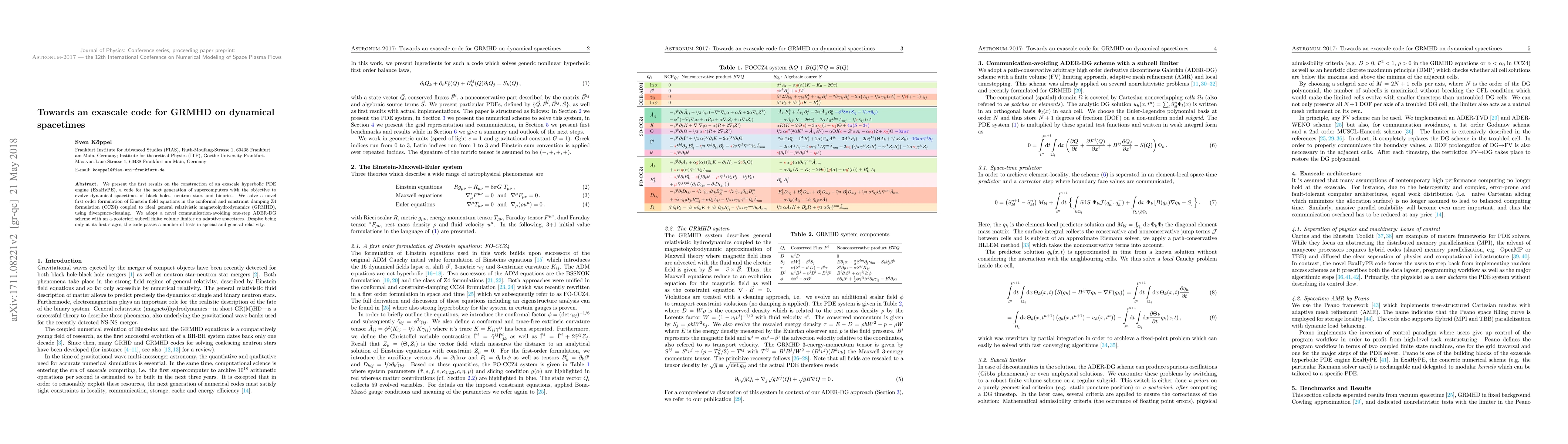 This paper introduces ExaHyPE, an exascale code for solving hyperbolic PDEs, specifically designed for simulating dynamical spacetimes in black holes, neutron stars, and binaries. The code employs a novel first-order formulation of the Einstein field equations in the CCZ4 scheme coupled with ideal GRMHD, utilizing a communication-avoiding ADER-DG scheme with adaptive spacetrees. Initial tests show promising results in both special and general relativity.