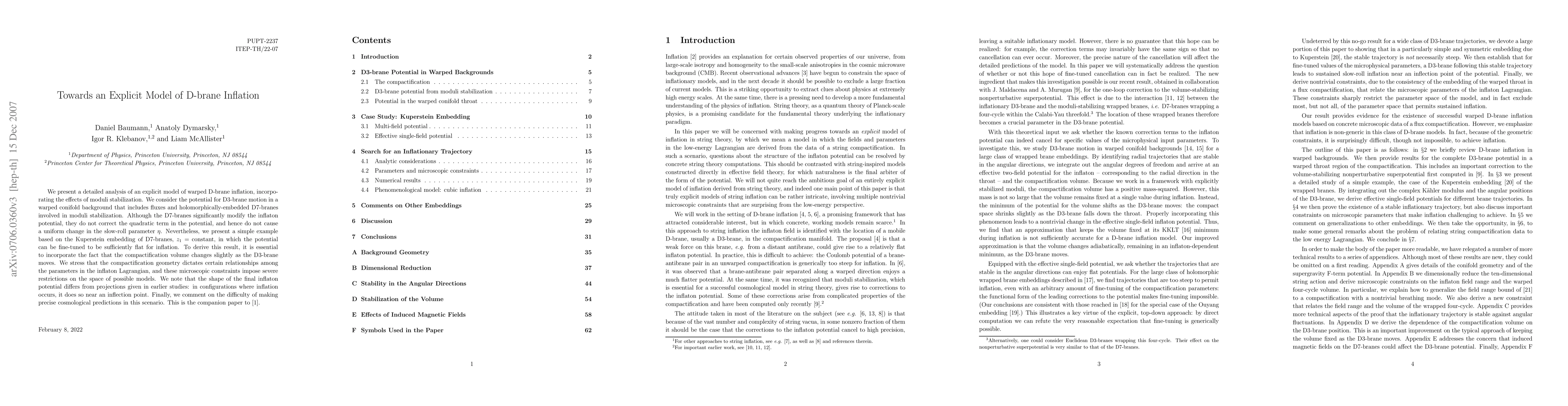 We present a detailed analysis of an explicit model of warped D-brane inflation, incorporating the effects of moduli stabilization. We consider the potential for D3-brane motion in a warped conifold background that includes fluxes and holomorphically-embedded D7-branes involved in moduli stabilization. Although the D7-branes significantly modify the inflaton potential, they do not correct the quadratic term in the potential, and hence do not cause a uniform change in the slow-roll parameter eta. Nevertheless, we present a simple example based on the Kuperstein embedding of D7-branes, z_1=constant, in which the potential can be fine-tuned to be sufficiently flat for inflation. To derive this result, it is essential to incorporate the fact that the compactification volume changes slightly as the D3-brane moves. We stress that the compactification geometry dictates certain relationships among the parameters in the inflaton Lagrangian, and these microscopic constraints impose severe restrictions on the space of possible models. We note that the shape of the final inflaton potential differs from projections given in earlier studies: in configurations where inflation occurs, it does so near an inflection point. Finally, we comment on the difficulty of making precise cosmological predictions in this scenario. This is the companion paper to arXiv:0705.3837.