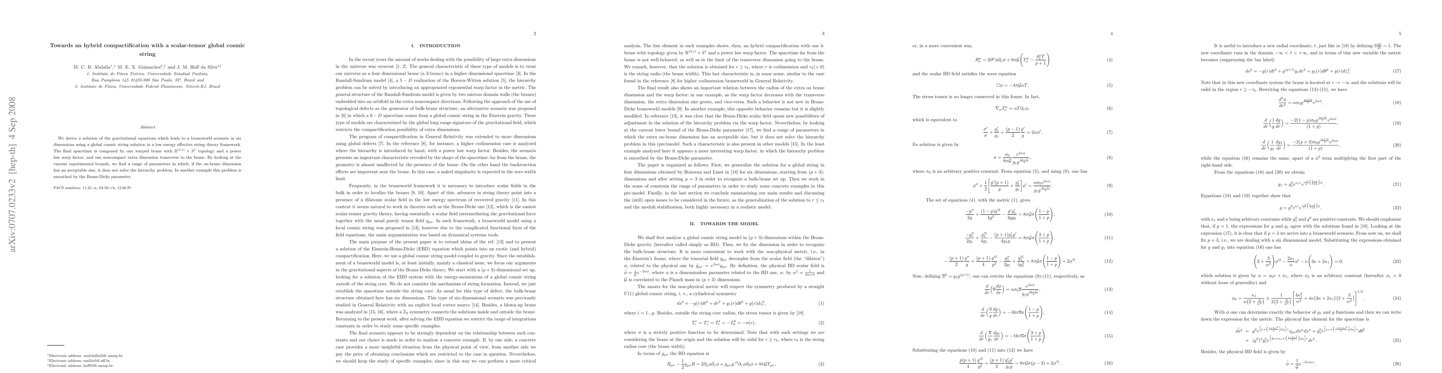We derive a solution of the gravitational equations which leads to a braneworld scenario in six dimensions using a global cosmic string solution in a low energy effective string theory framework. The final spacetime is composed by one warped brane with $\mathbb{R}^{(3,1)}\times S^{1}$ topology and a power law warp factor, and one noncompact extra dimension transverse to the brane. By looking at the current experimental bounds, we find a range of parameters in which, if the on-brane dimension has an acceptable size, it does not solve the hierarchy problem. In another example this problem is smoothed by the Brans-Dicke parameter.