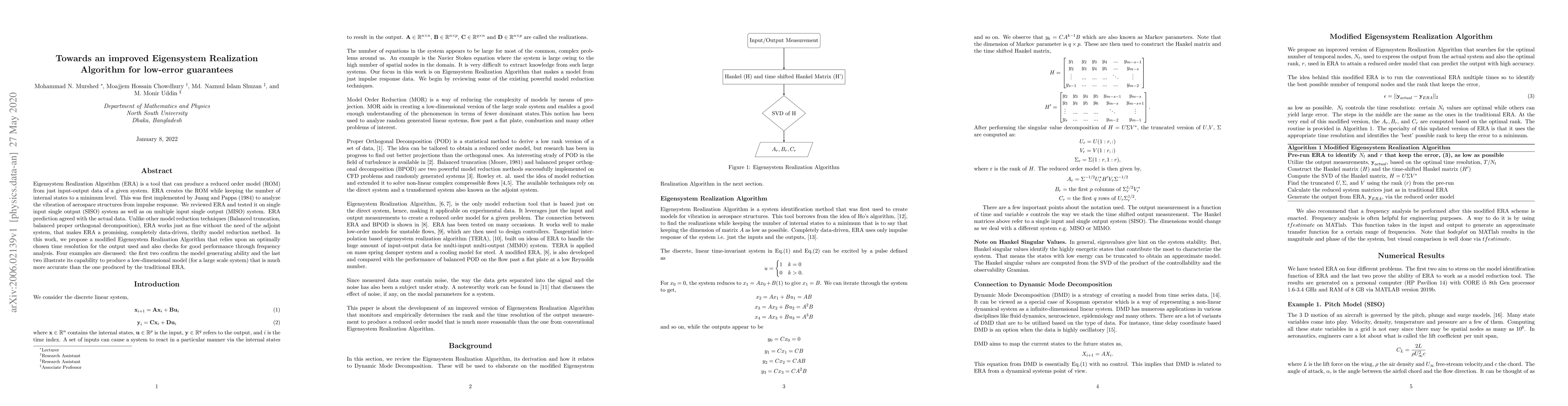 Eigensystem Realization Algorithm (ERA) is a tool that can produce a reduced order model (ROM) from just input-output data of a given system. ERA creates the ROM while keeping the number of internal states to a minimum level. This was first implemented by Juang and Pappa (1984) to analyze the vibration of aerospace structures from impulse response. We reviewed ERA and tested it on single input single output (SISO) system as well as on multiple input single output (MISO) system. ERA prediction agreed with the actual data. Unlike other model reduction techniques (Balanced truncation, balanced proper orthogonal decomposition), ERA works just as fine without the need of the adjoint system, that makes ERA a promising, completely data-driven, thrifty model reduction method. In this work, we propose a modified Eigensystem Realization Algorithm that relies upon an optimally chosen time resolution for the output used and also checks for good performance through frequency analysis. Four examples are discussed: the first two confirm the model generating ability and the last two illustrate its capability to produce a low-dimensional model (for a large scale system) that is much more accurate than the one produced by the traditional ERA.
