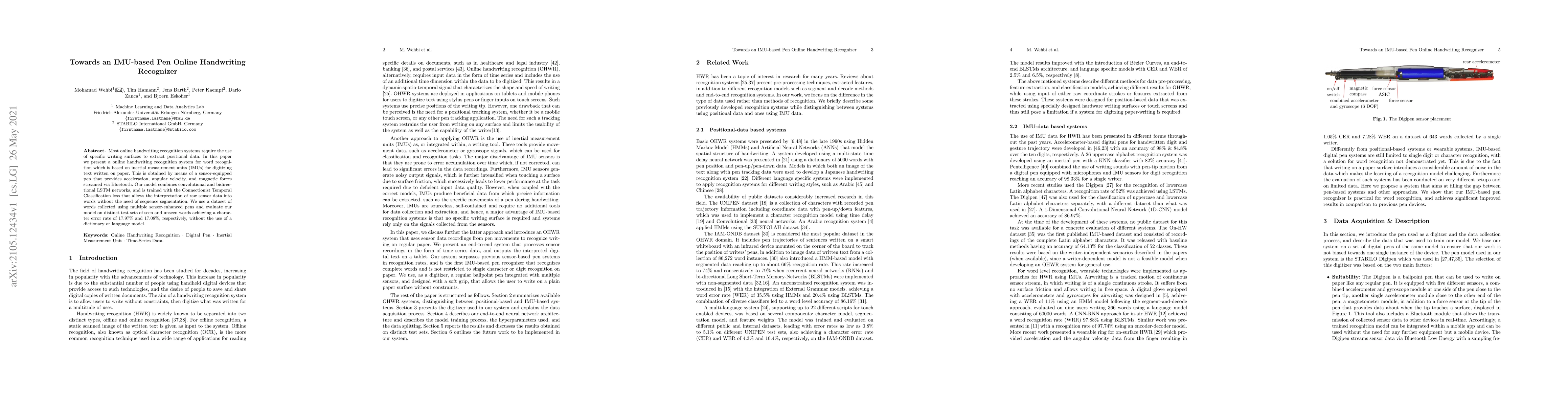 This paper proposes an online handwriting recognition system using IMUs in a sensor-equipped pen to digitize handwriting on paper, eliminating the need for specific writing surfaces. The model combines convolutional and bidirectional LSTM networks, achieving a character error rate of 17.97% for seen words and 17.08% for unseen words without a dictionary or language model.