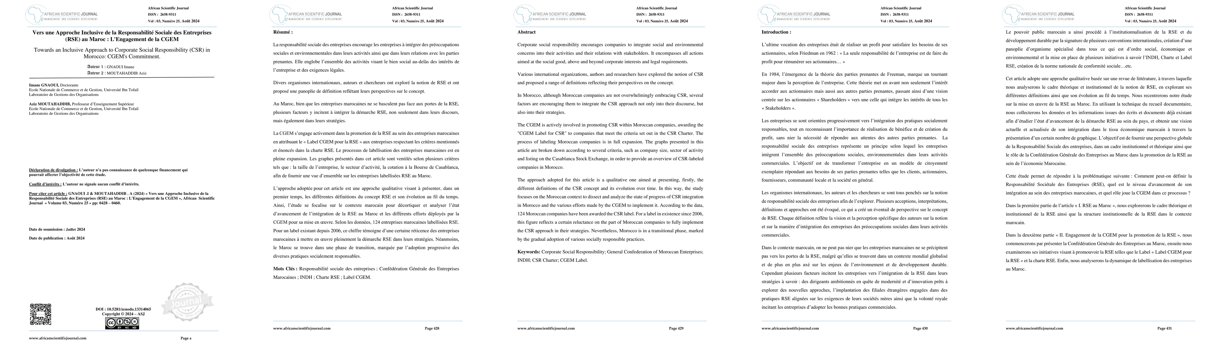 Corporate social responsibility encourages companies to integrate social and environmental concerns into their activities and their relations with stakeholders. It encompasses all actions aimed at the social good, above and beyond corporate interests and legal requirements. Various international organizations, authors and researchers have explored the notion of CSR and proposed a range of definitions reflecting their perspectives on the concept. In Morocco, although Moroccan companies are not overwhelmingly embracing CSR, several factors are encouraging them to integrate the CSR approach not only into their discourse, but also into their strategies. The CGEM is actively involved in promoting CSR within Moroccan companies, awarding the "CGEM Label for CSR" to companies that meet the criteria set out in the CSR Charter. The process of labeling Moroccan companies is in full expansion. The graphs presented in this article are broken down according to several criteria, such as company size, sector of activity and listing on the Casablanca Stock Exchange, in order to provide an overview of CSR-labeled companies in Morocco. The approach adopted for this article is a qualitative one aimed at presenting, firstly, the different definitions of the CSR concept and its evolution over time. In this way, the study focuses on the Moroccan context to dissect and analyze the state of progress of CSR integration in Morocco and the various efforts made by the CGEM to implement it. According to the data, 124 Moroccan companies have been awarded the CSR label. For a label in existence since 2006, this figure reflects a certain reluctance on the part of Moroccan companies to fully implement the CSR approach in their strategies. Nevertheless, Morocco is in a transitional phase, marked by the gradual adoption of various socially responsible practices.
