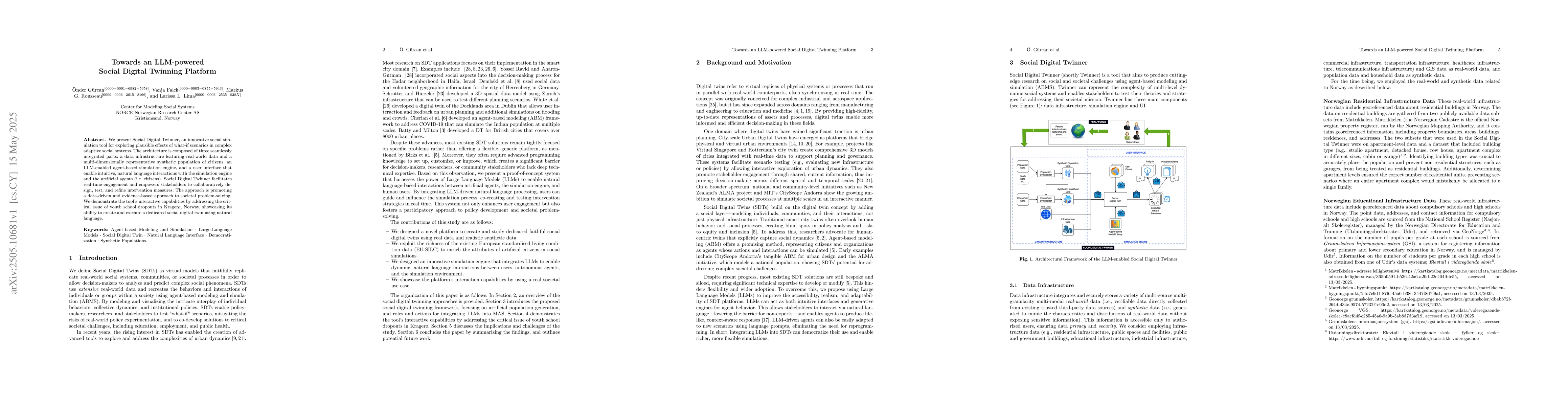 The paper introduces Social Digital Twinner, a social simulation tool integrating real-world data, synthetic population, LLM-enabled agent-based simulation, and natural language user interface for exploring what-if scenarios in complex social systems.