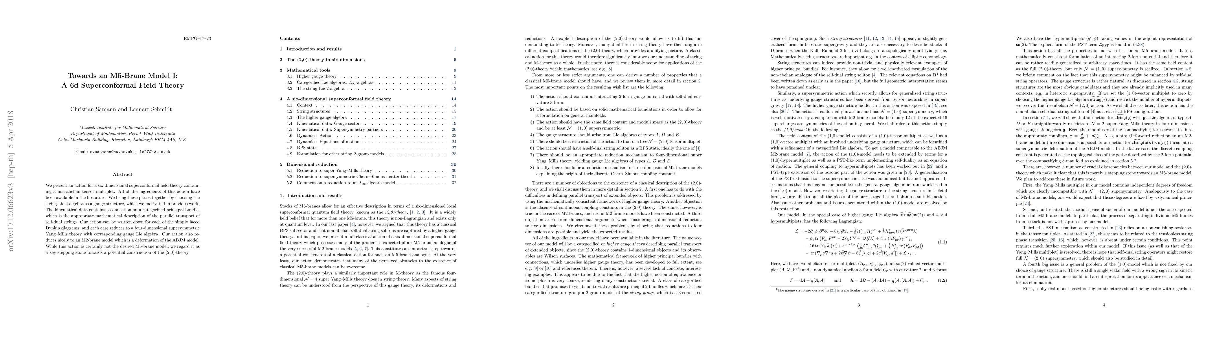 We present an action for a six-dimensional superconformal field theory containing a non-abelian tensor multiplet. All of the ingredients of this action have been available in the literature. We bring these pieces together by choosing the string Lie 2-algebra as a gauge structure, which we motivated in previous work. The kinematical data contains a connection on a categorified principal bundle, which is the appropriate mathematical description of the parallel transport of self-dual strings. Our action can be written down for each of the simply laced Dynkin diagrams, and each case reduces to a four-dimensional supersymmetric Yang--Mills theory with corresponding gauge Lie algebra. Our action also reduces nicely to an M2-brane model which is a deformation of the ABJM model. While this action is certainly not the desired M5-brane model, we regard it as a key stepping stone towards a potential construction of the (2,0)-theory.