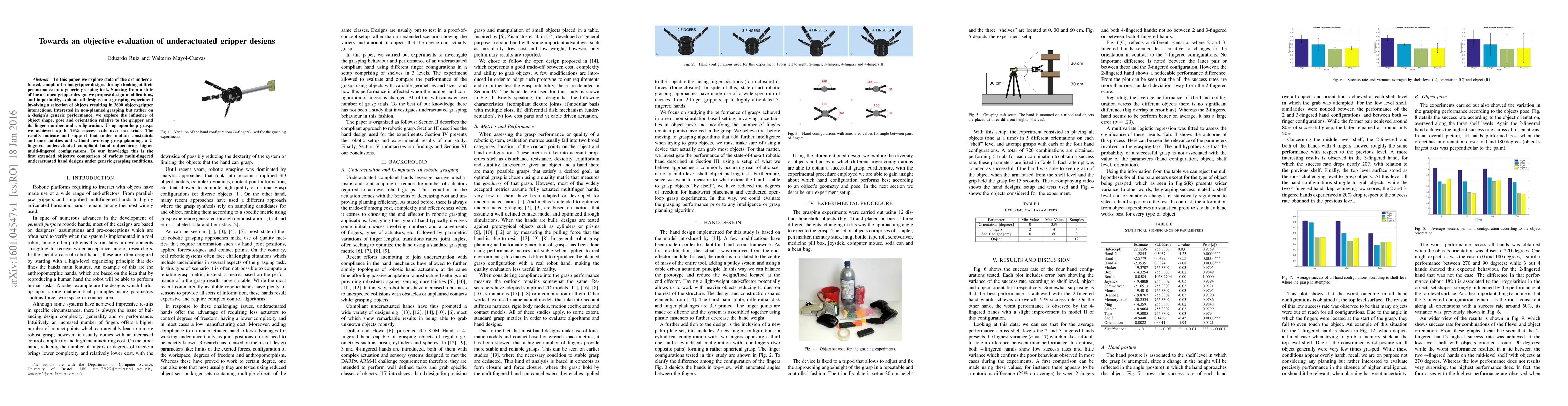 A study compares 2-fingered underactuated gripper designs outperforming higher multi-fingered configurations in non-planned grasping tasks, with up to 75% success rate.