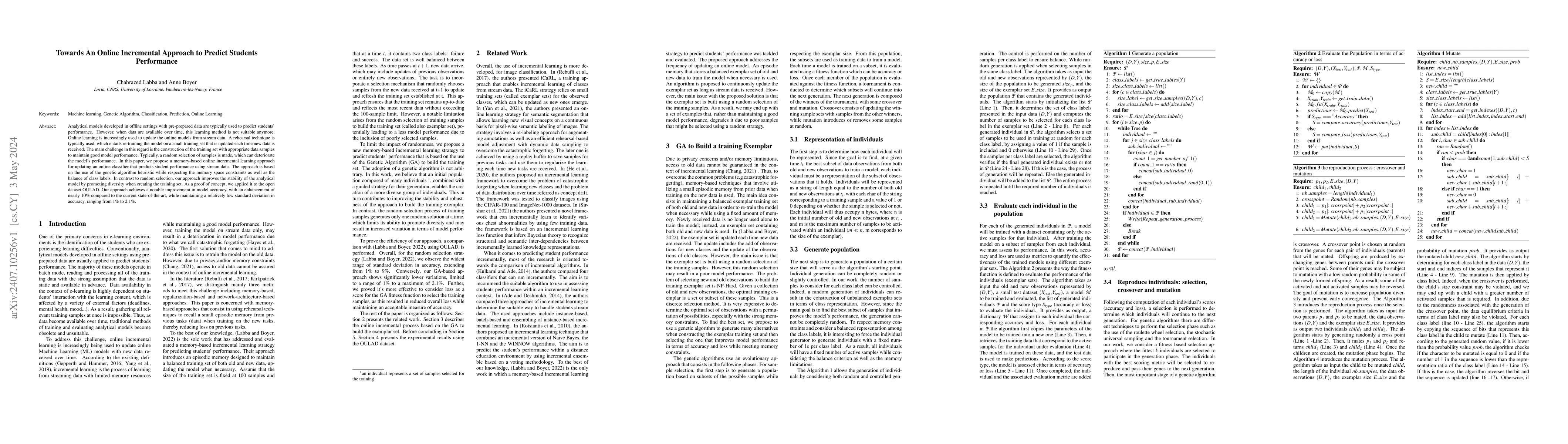 Analytical models developed in offline settings with pre-prepared data are typically used to predict students' performance. However, when data are available over time, this learning method is not suitable anymore. Online learning is increasingly used to update the online models from stream data. A rehearsal technique is typically used, which entails re-training the model on a small training set that is updated each time new data is received. The main challenge in this regard is the construction of the training set with appropriate data samples to maintain good model performance. Typically, a random selection of samples is made, which can deteriorate the model's performance. In this paper, we propose a memory-based online incremental learning approach for updating an online classifier that predicts student performance using stream data. The approach is based on the use of the genetic algorithm heuristic while respecting the memory space constraints as well as the balance of class labels. In contrast to random selection, our approach improves the stability of the analytical model by promoting diversity when creating the training set. As a proof of concept, we applied it to the open dataset OULAD. Our approach achieves a notable improvement in model accuracy, with an enhancement of nearly 10% compared to the current state-of-the-art, while maintaining a relatively low standard deviation in accuracy, ranging from 1% to 2.1%.