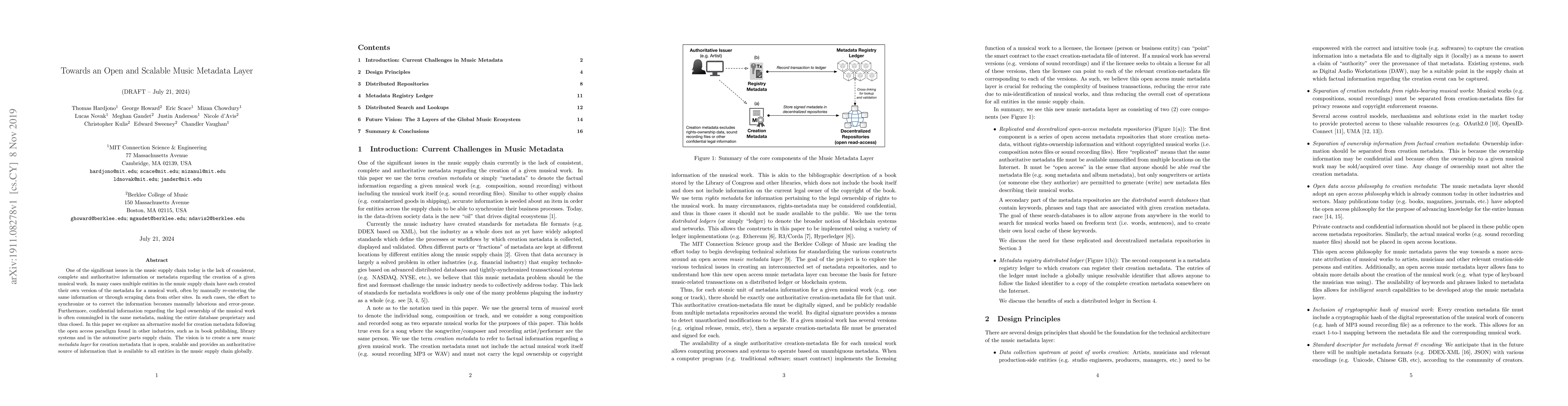 This paper proposes a new open and scalable music metadata layer to address inconsistencies and lack of authoritative information in the music supply chain. It aims to create a globally accessible, standardized metadata source to improve data synchronization and transparency.