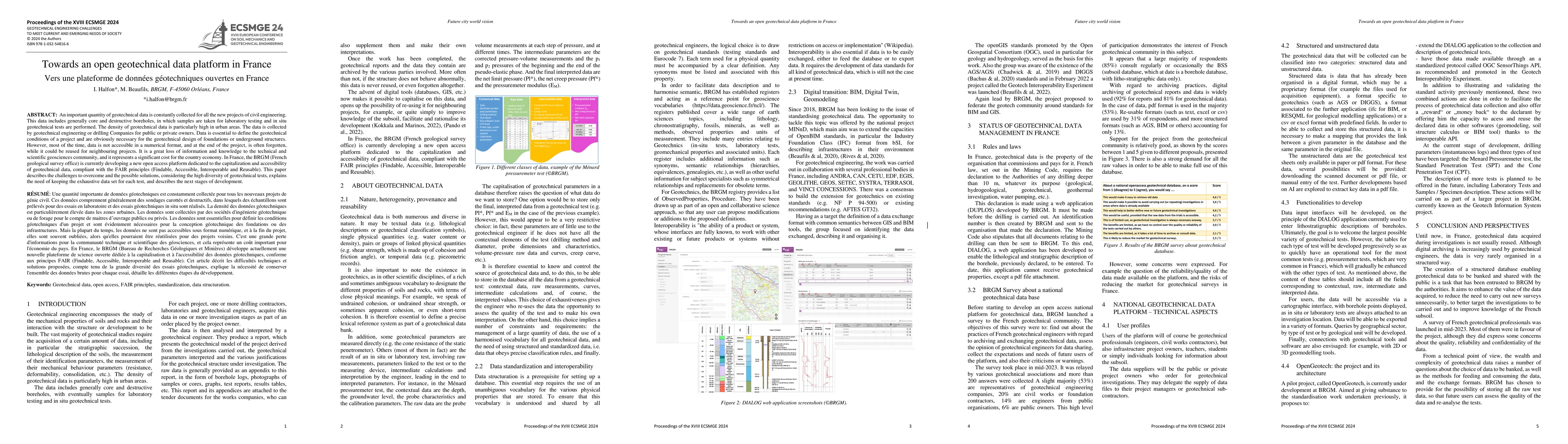 The paper describes challenges and solutions for developing an open geotechnical data platform in France, considering diverse geotechnical tests and data preservation.