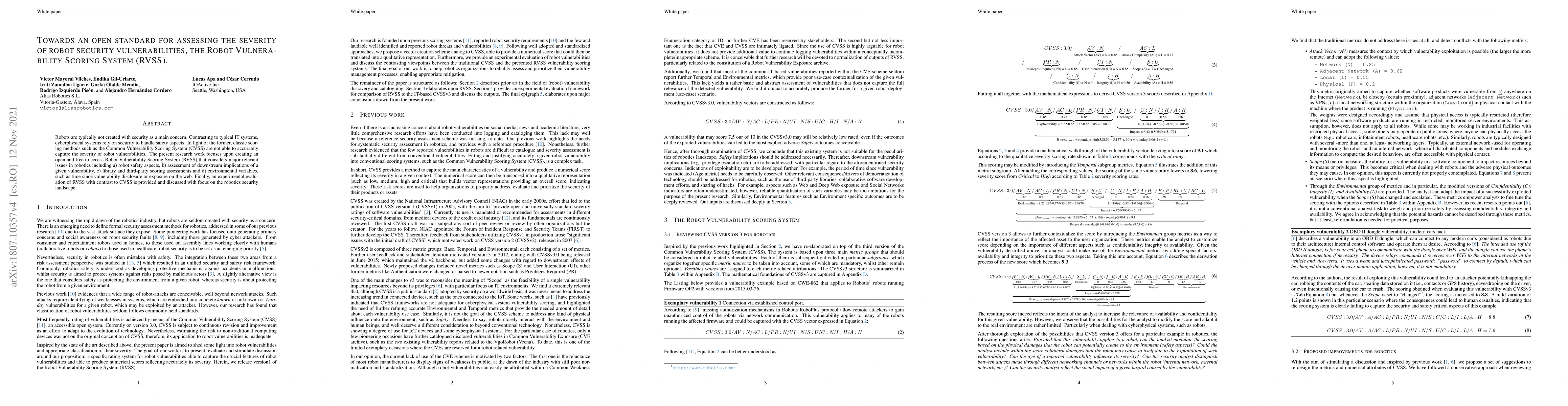 This paper proposes the Robot Vulnerability Scoring System (RVSS) to assess robot security vulnerabilities, addressing limitations of existing IT-focused scoring methods like CVSS. RVSS considers robot safety, downstream implications, third-party assessments, and environmental factors, followed by an experimental evaluation comparing it to CVSS in the context of robotics security.