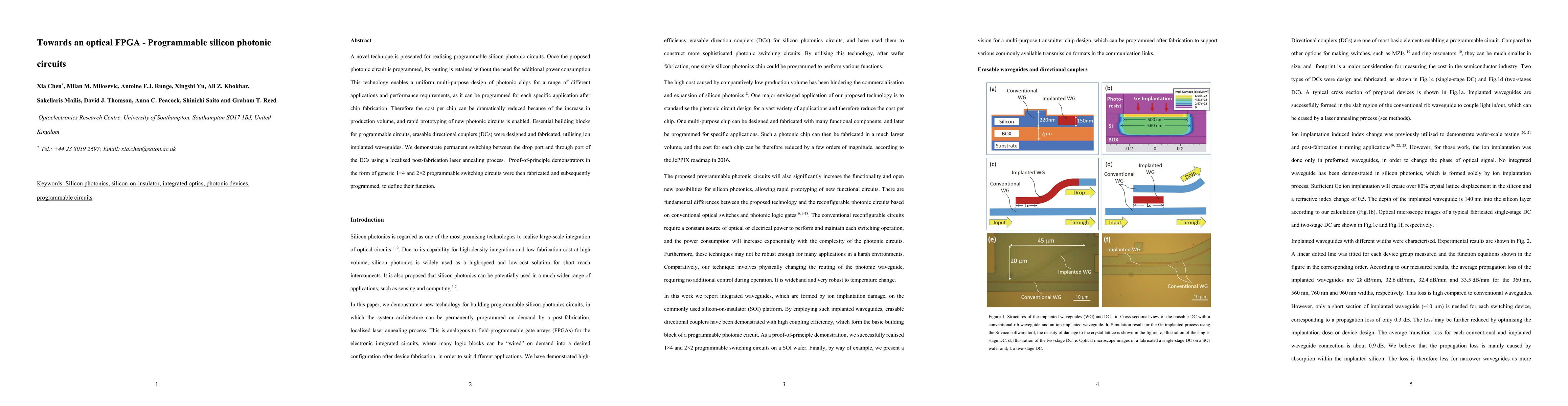 This paper introduces a technique for creating programmable silicon photonic circuits using erasable directional couplers, which allows for post-fabrication programming without additional power. This innovation reduces chip costs and enables rapid prototyping of various photonic circuits.