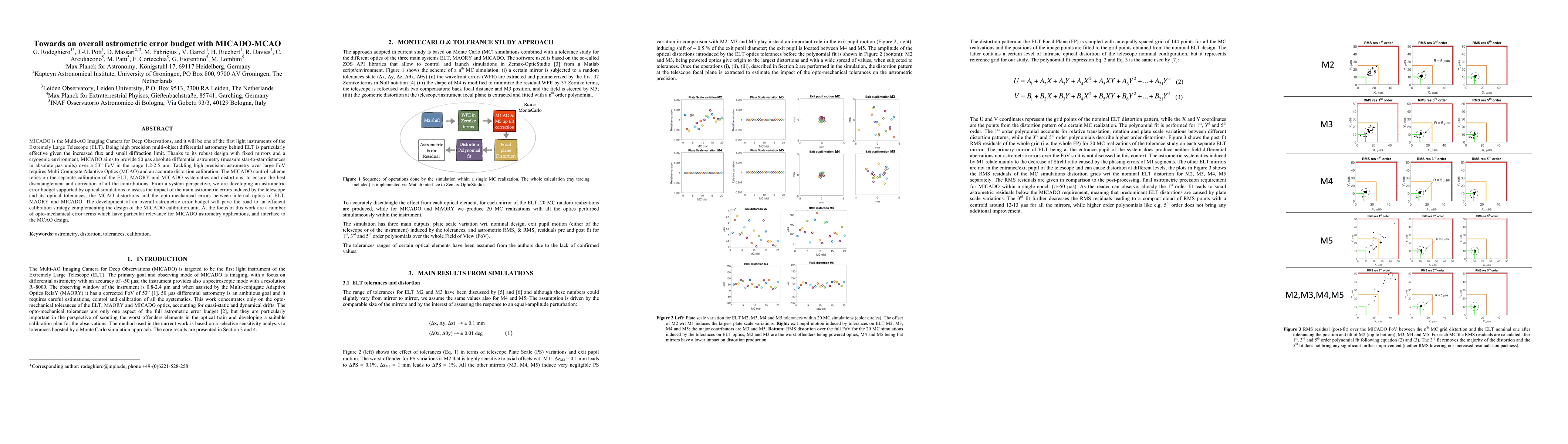 MICADO is the Multi-AO Imaging Camera for Deep Observations, and it will be one of the first light instruments of the Extremely Large Telescope (ELT). Doing high precision multi-object differential astrometry behind ELT is particularly effective given the increased flux and small diffraction limit. Thanks to its robust design with fixed mirrors and a cryogenic environment, MICADO aims to provide 50 $\mu$as absolute differential astrometry (measure star-to-star distances in absolute $\mu$as units) over a 53" FoV in the range 1.2-2.5 $\mu$m. Tackling high precision astrometry over large FoV requires Multi Conjugate Adaptive Optics (MCAO) and an accurate distortion calibration. The MICADO control scheme relies on the separate calibration of the ELT, MAORY and MICADO systematics and distortions, to ensure the best disentanglement and correction of all the contributions. From a system perspective, we are developing an astrometric error budget supported by optical simulations to assess the impact of the main astrometric errors induced by the telescope and its optical tolerances, the MCAO distortions and the opto-mechanical errors between internal optics of ELT, MAORY and MICADO. The development of an overall astrometric error budget will pave the road to an efficient calibration strategy complementing the design of the MICADO calibration unit. At the focus of this work are a number of opto-mechanical error terms which have particular relevance for MICADO astrometry applications, and interface to the MCAO design.