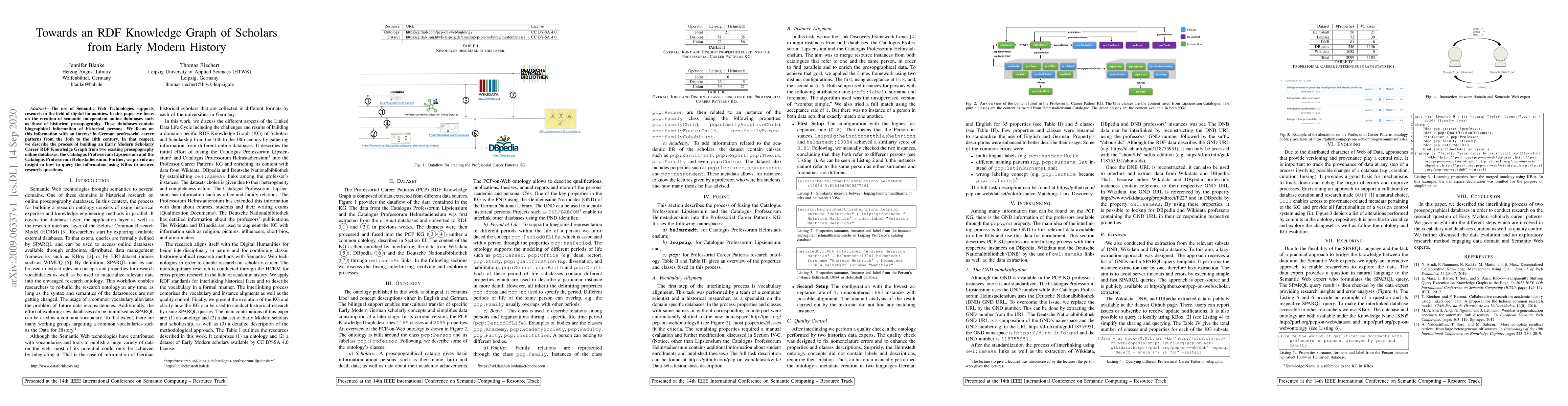 This paper creates an RDF knowledge graph of German professors' careers from 16th to 18th century using existing online databases, enabling research questions to be answered through KBox queries.