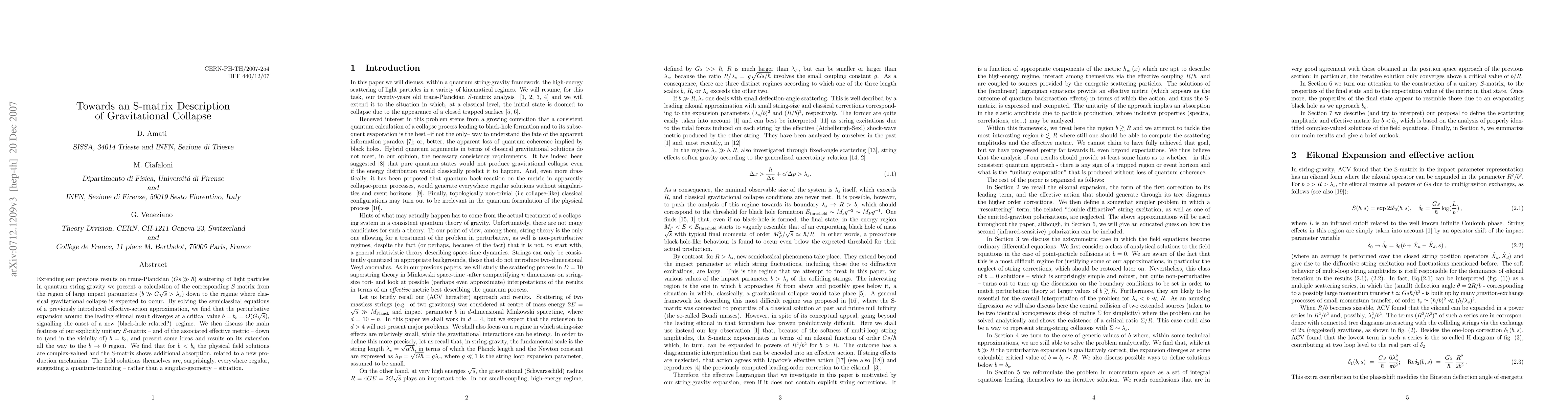 This paper extends previous results on trans-Planckian scattering in quantum string-gravity to derive an S-matrix for gravitational collapse, revealing a divergence at a critical impact parameter signaling the onset of a new regime. The study finds complex-valued field solutions and additional absorption in the S-matrix, suggesting a quantum-tunneling scenario rather than singular geometry.