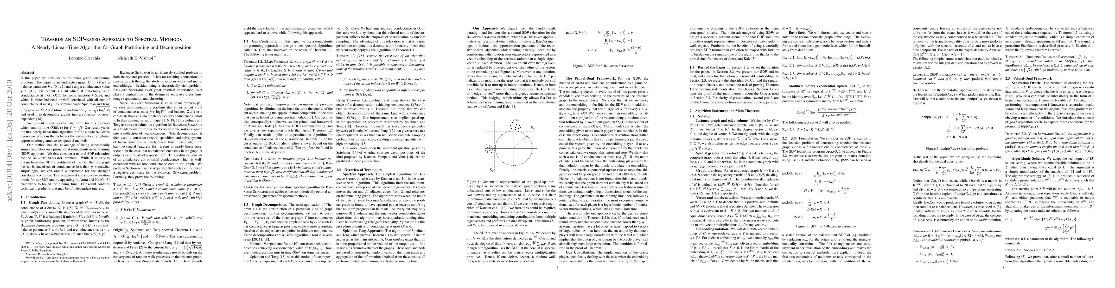 This paper presents a nearly-linear time spectral algorithm for graph partitioning, achieving a $\tilde{O}(|E|/\gamma)$ runtime for $f=\sqrt{\gamma}$ and leveraging a primal-dual semidefinite-programming approach. The method provides an optimal approximation guarantee for the Balanced Separator problem and introduces a novel separation oracle for the SDP relaxation.