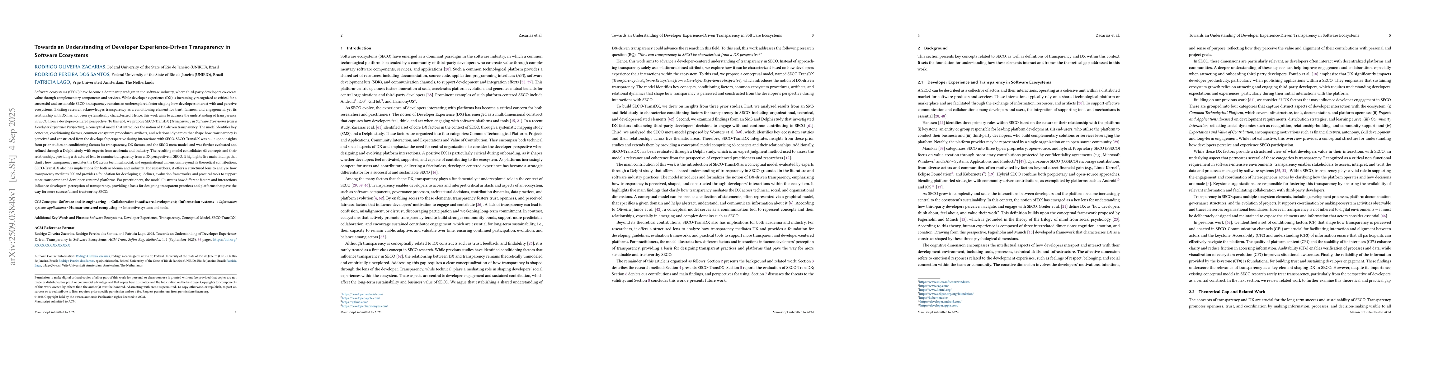 Software ecosystems (SECO) have become a dominant paradigm in the software industry, enabling third-party developers to co-create value through complementary components and services. While Developer Experience (DX) is increasingly recognized as critical for sustainable SECO, transparency remains an underexplored factor shaping how developers perceive and interact with ecosystems. Existing studies acknowledge transparency as essential for trust, fairness, and engagement, yet its relationship with DX has not been systematically conceptualized. Hence, this work aims to advance the understanding of transparency in SECO from a developer-centered perspective. To this end, we propose SECO-TransDX (Transparency in Software Ecosystems from a Developer Experience Perspective), a conceptual model that introduces the notion of DX-driven transparency. The model identifies 63 interrelated concepts, including conditioning factors, ecosystem procedures, artifacts, and relational dynamics that influence how transparency is perceived and constructed during developer interactions. SECO-TransDX was built upon prior research and refined through a Delphi study with experts from academia and industry. It offers a structured lens to examine how transparency mediates DX across technical, social, and organizational layers. For researchers, it lays the groundwork for future studies and tool development; for practitioners, it supports the design of trustworthy, developer-centered platforms that improve transparency and foster long-term engagement in SECO.