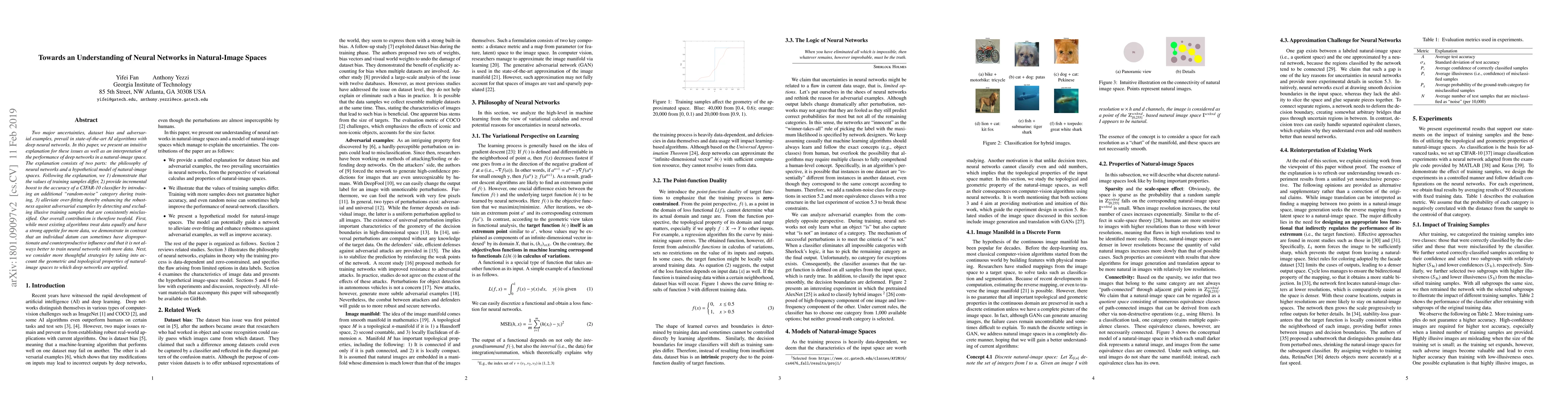 Two major uncertainties, dataset bias and adversarial examples, prevail in state-of-the-art AI algorithms with deep neural networks. In this paper, we present an intuitive explanation for these issues as well as an interpretation of the performance of deep networks in a natural-image space. The explanation consists of two parts: the philosophy of neural networks and a hypothetical model of natural-image spaces. Following the explanation, we 1) demonstrate that the values of training samples differ, 2) provide incremental boost to the accuracy of a CIFAR-10 classifier by introducing an additional "random-noise" category during training, 3) alleviate over-fitting thereby enhancing the robustness against adversarial examples by detecting and excluding illusive training samples that are consistently misclassified. Our overall contribution is therefore twofold. First, while most existing algorithms treat data equally and have a strong appetite for more data, we demonstrate in contrast that an individual datum can sometimes have disproportionate and counterproductive influence and that it is not always better to train neural networks with more data. Next, we consider more thoughtful strategies by taking into account the geometric and topological properties of natural-image spaces to which deep networks are applied.