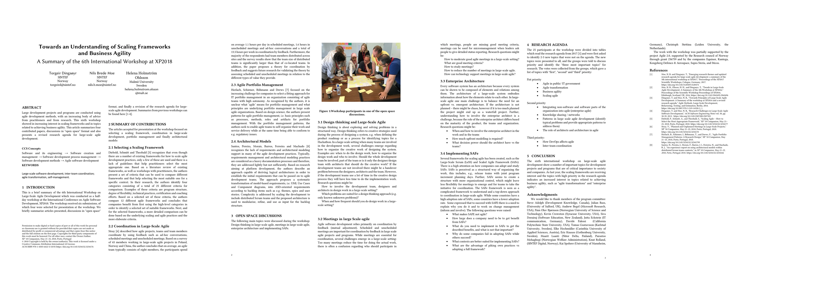 Large development projects and programs are conducted using agile development methods, with an increasing body of advice from practitioners and from research. This sixth workshop showed in increasing interest in scaling frameworks and in topics related to achieving business agility. This article summarizes four contributed papers, discussions in "open space" format and also presents a revised research agenda for large-scale agile development.