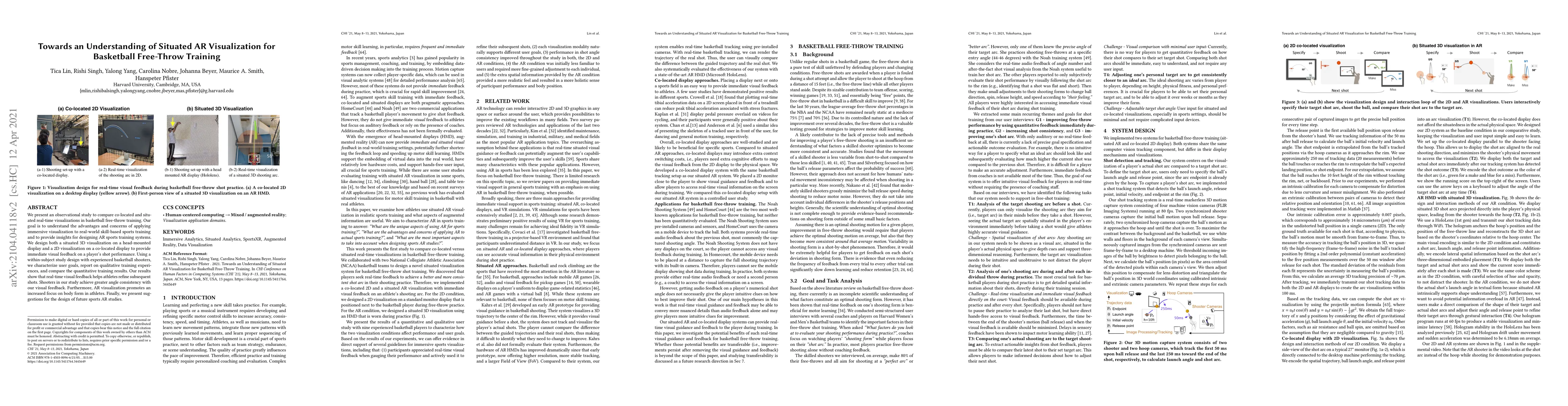 This study compares co-located and situated real-time visualizations for basketball free-throw training, finding that immersive AR visualization on a head-mounted display enhances angle consistency and promotes focus on body form, while providing insights for designing future AR sports training systems.