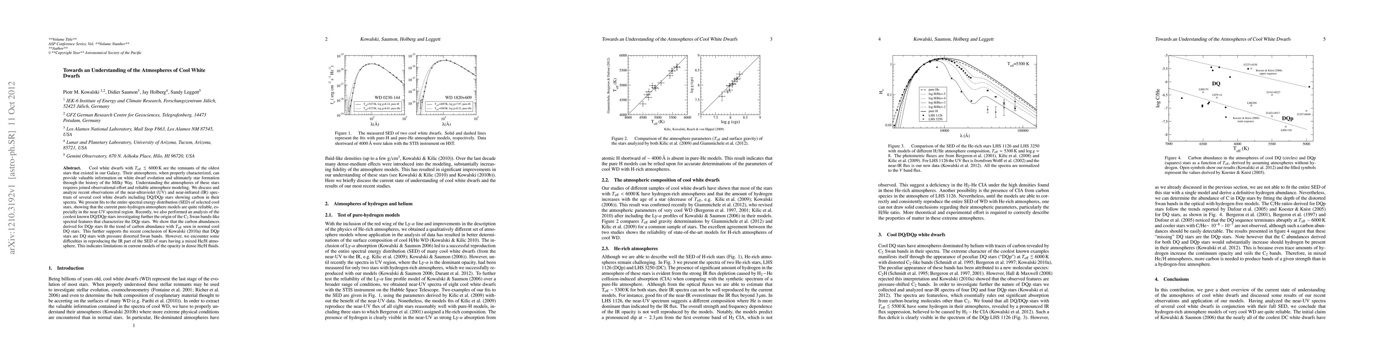 Cool white dwarfs with Teff < 6000 K are the remnants of the oldest stars that existed in our Galaxy. Their atmospheres, when properly characterized, can provide valuable information on white dwarf evolution and ultimately star formation through the history of the Milky Way. Understanding the atmospheres of these stars requires joined observational effort and reliable atmosphere modeling. We discuss and analyze recent observations of the near-ultraviolet (UV) and near-infrared (IR) spectrum of several cool white dwarfs including DQ/DQp stars showing carbon in their spectra. We present fits to the entire spectral energy distribution (SED) of selected cool stars, showing that the current pure-hydrogen atmosphere models are quite reliable, especially in the near-UV spectral region. Recently, we also performed an analysis of the coolest known DQ/DQp stars investigating further the origin of the C2 Swan bands-like spectral features that characterize the DQp stars. We show that the carbon abundances derived for DQp stars fit the trend of carbon abundance with Teff seen in normal cool DQ stars. This further supports the recent conclusion of Kowalski A&A (2010) that DQp stars are DQ stars with pressure distorted Swan bands. However, we encounter some difficulties in reproducing the IR part of the SED of stars having a mixed He/H atmosphere. This indicates limitations in current models of the opacity in dense He/H fluids.