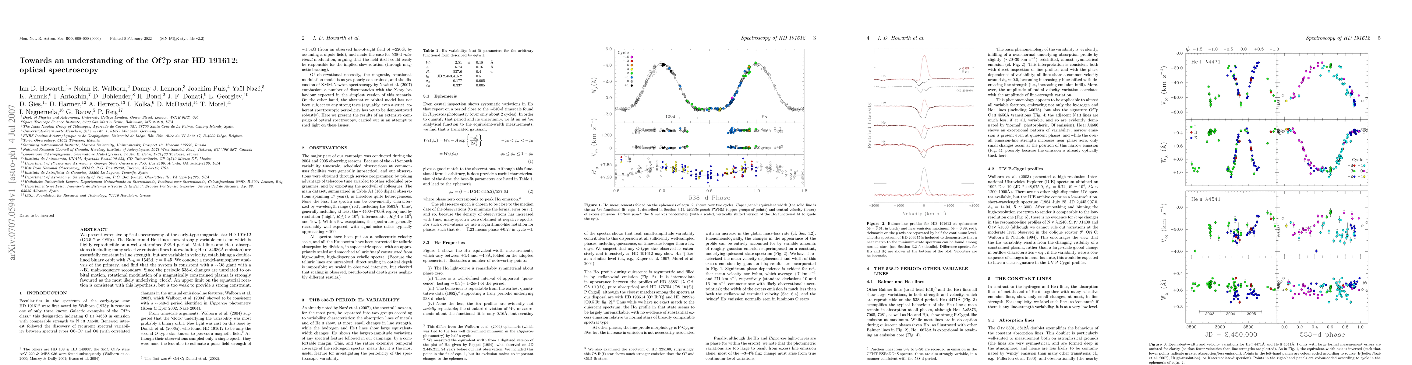 We present extensive optical spectroscopy of the early-type magnetic star HD 191612 (O6.5f?pe-O8fp). The Balmer and HeI lines show strongly variable emission which is highly reproducible on a well-determined 538-d period. Metal lines and HeII absorptions (including many selective emission lines but excluding He II 4686A emission) are essentially constant in line strength, but are variable in velocity, establishing a double-lined binary orbit with P(orb) = 1542d, e=0.45. We conduct a model-atmosphere analysis of the primary, and find that the system is consistent with a O8: giant with a B1: main-sequence secondary. Since the periodic 538-d changes are unrelated to orbital motion, rotational modulation of a magnetically constrained plasma is strongly favoured as the most likely underlying `clock'. An upper limit on the equatorial rotation is consistent with this hypothesis, but is too weak to provide a strong constraint.