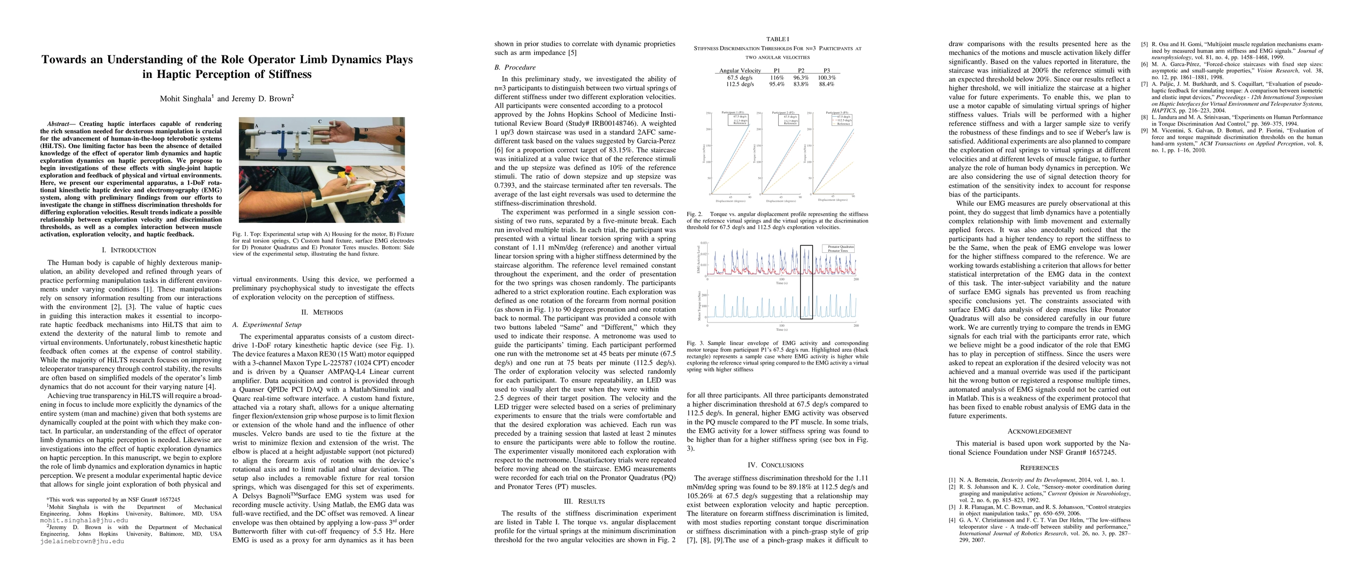 Creating haptic interfaces capable of rendering the rich sensation needed for dexterous manipulation is crucial for the advancement of human-in-the-loop telerobotic systems (HiLTS). One limiting factor has been the absence of detailed knowledge of the effect of operator limb dynamics and haptic exploration dynamics on haptic perception. We propose to begin investigations of these effects with single-joint haptic exploration and feedback of physical and virtual environments. Here, we present our experimental apparatus, a 1-DoF rotational kinesthetic haptic device and electromyography (EMG) system, along with preliminary findings from our efforts to investigate the change in stiffness discrimination thresholds for differing exploration velocities. Result trends indicate a possible relationship between exploration velocity and discrimination thresholds, as well as a complex interaction between muscle activation, exploration velocity, and haptic feedback.