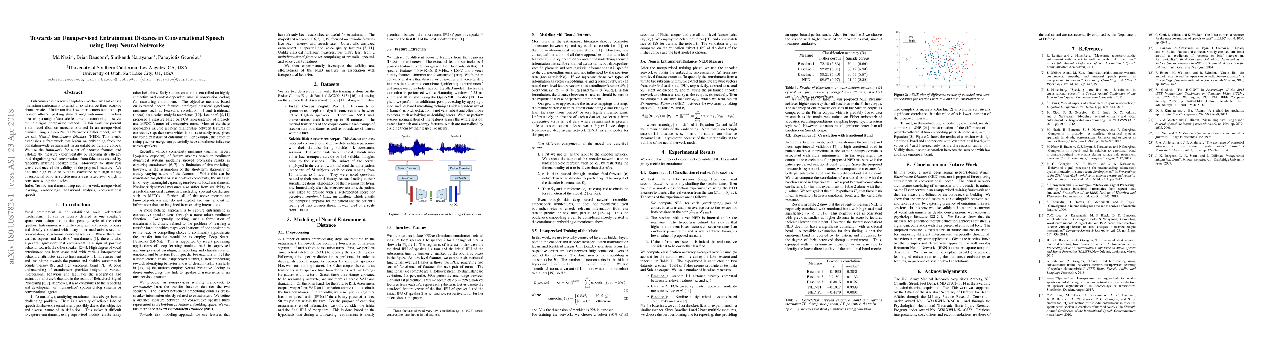 This paper introduces a Neural Entrainment Distance (NED) metric using a Deep Neural Network to measure entrainment in conversational speech without labeled data. The proposed metric distinguishes real conversations from shuffled ones and correlates high NED values with stronger emotional bonds in suicide assessment interviews.