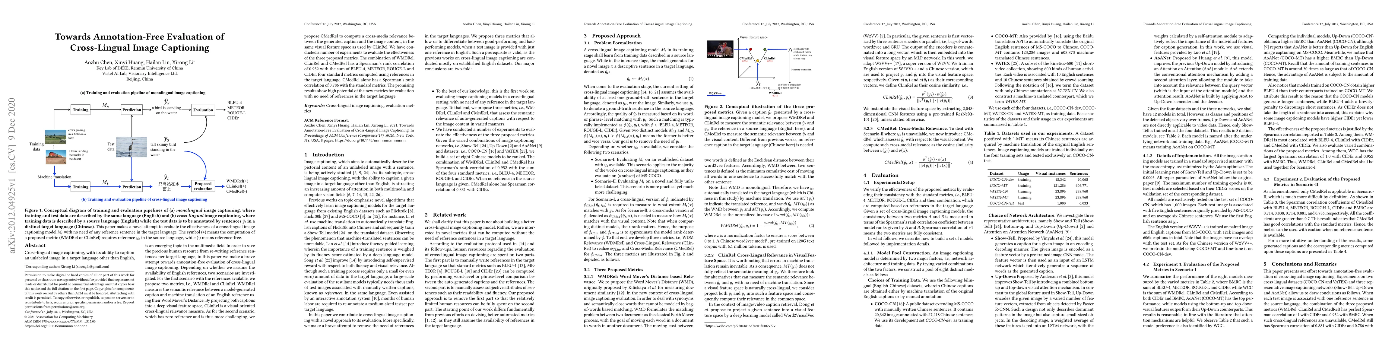 This paper explores annotation-free evaluation methods for cross-lingual image captioning, proposing metrics like WMDRel and CLinRel when English references are available, and CMedRel for scenarios without any references. The new metrics show promising results for assessing model-generated captions without requiring target language references.