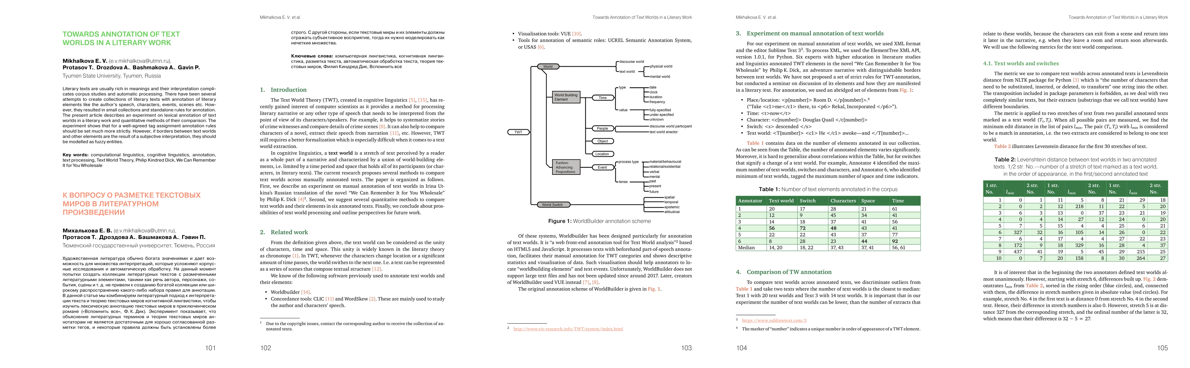 Literary texts are usually rich in meanings and their interpretation complicates corpus studies and automatic processing. There have been several attempts to create collections of literary texts with annotation of literary elements like the author's speech, characters, events, scenes etc. However, they resulted in small collections and standalone rules for annotation. The present article describes an experiment on lexical annotation of text worlds in a literary work and quantitative methods of their comparison. The experiment shows that for a well-agreed tag assignment annotation rules should be set much more strictly. However, if borders between text worlds and other elements are the result of a subjective interpretation, they should be modeled as fuzzy entities.