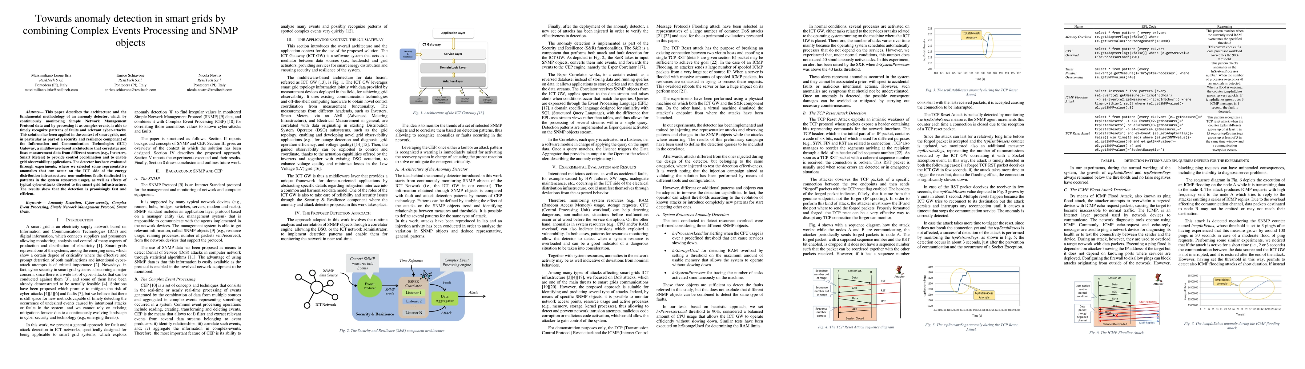 This paper proposes an anomaly detector for smart grids using Complex Event Processing on SNMP data to swiftly identify fault patterns and cyber-attacks. Evaluated within an ICT Gateway architecture, the method demonstrated fast and efficient detection of both non-malicious faults and cyber-attack effects.