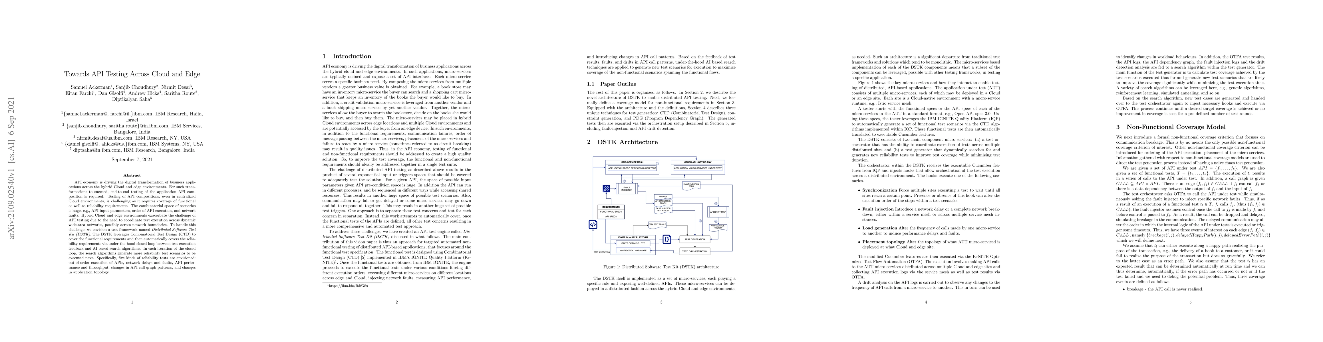 This paper proposes a test framework, Distributed Software Test Kit (DSTK), to address the challenges of API testing across hybrid Cloud and edge environments. DSTK uses Combinatorial Test Design and AI-based search algorithms to dynamically generate test scenarios covering both functional and reliability requirements.